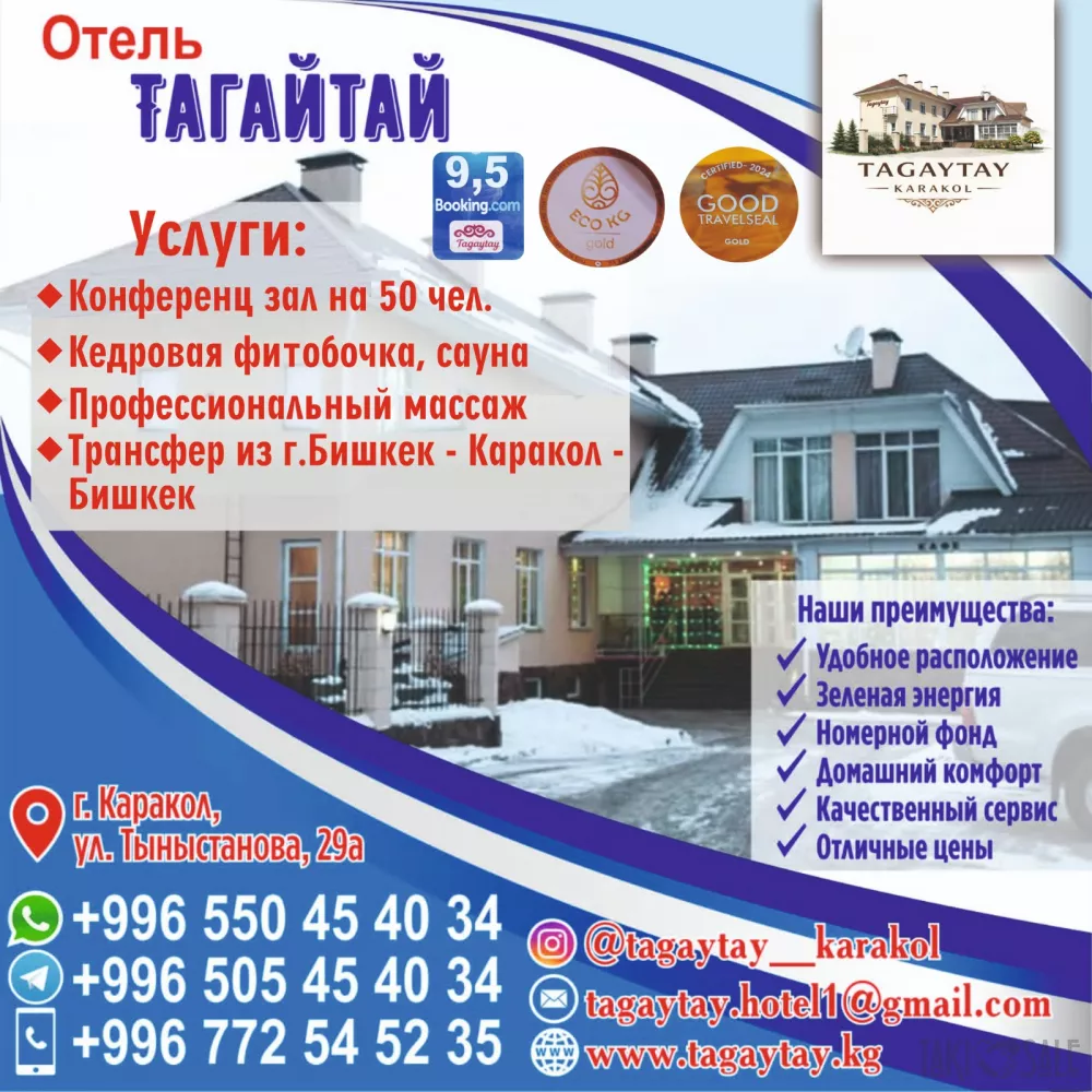 Отель «Тагайтай» находится в тихом, уютном месте в самом центре города Каракол, недалеко от городской площади и Иссык-Кульского Государственного Университета, в 20 минутах езды от горнолыжной базы Каракол.