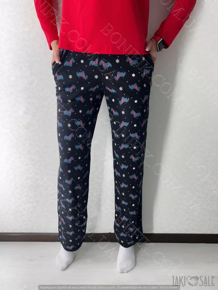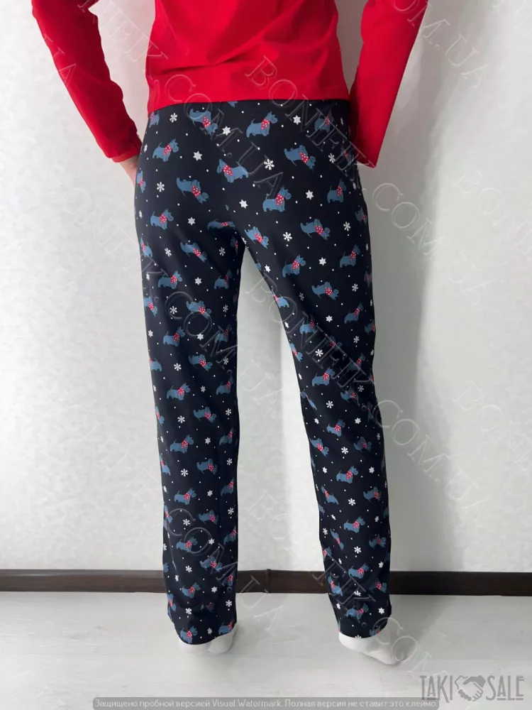 Брюки на зручній резинці виконані в темній гаммі, прикрашені аналогічним новорічним малюнком, що створює гармонічний комплект і робить образ особливо атмосферним.
