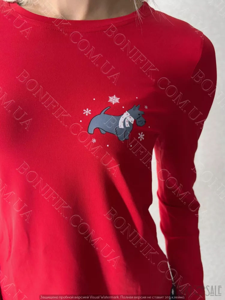М'який лонгслів насиченого червоного кольору одразу зверне увагу — він не тільки виглядає святково, але і піднімає настрій завдяки милому принту з кумедним песиком та сніжинками.