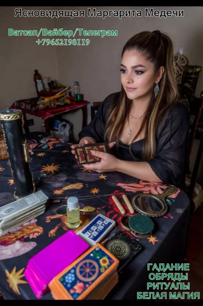С гаданиями и обрядами в это время работает Маргарита Медечи — опытный таролог, ясновидящая, сертифицированный нумеролог, астролог и хиромант. Она помогает разобраться в запутанных жизненных ситуациях, получить честные ответы на важные вопросы и принять верные решения.