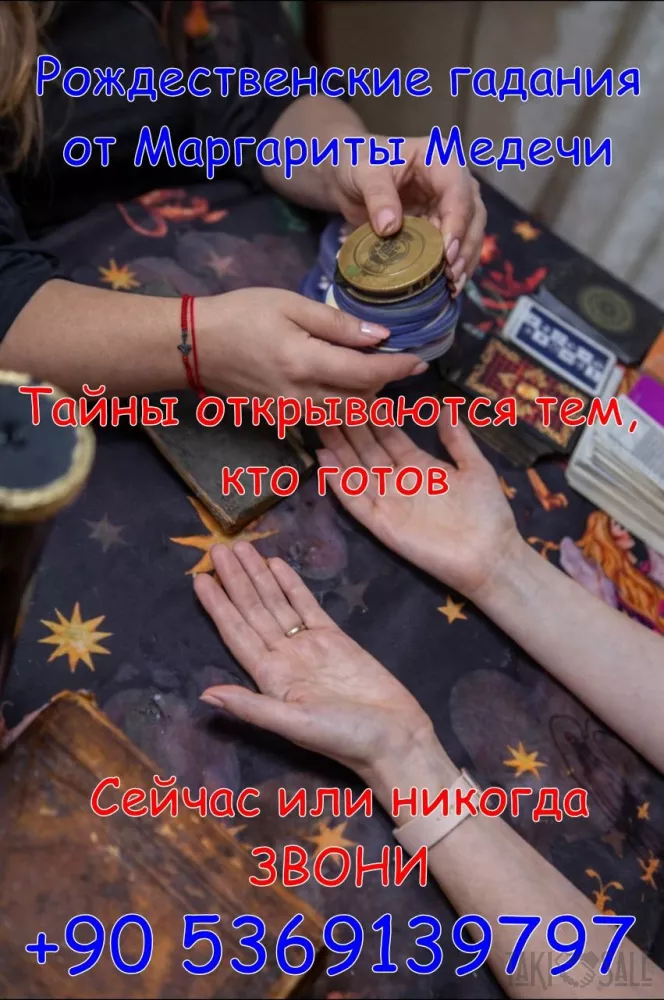 Маргарита проводит гадания на картах Таро, по кофейной гуще и линиям руки, которые позволяют увидеть ключевые события будущего, возможные препятствия и перспективы в любви, финансах и личной жизни. В новогодний и рождественский период такие гадания дают особенно глубокую и точную информацию.