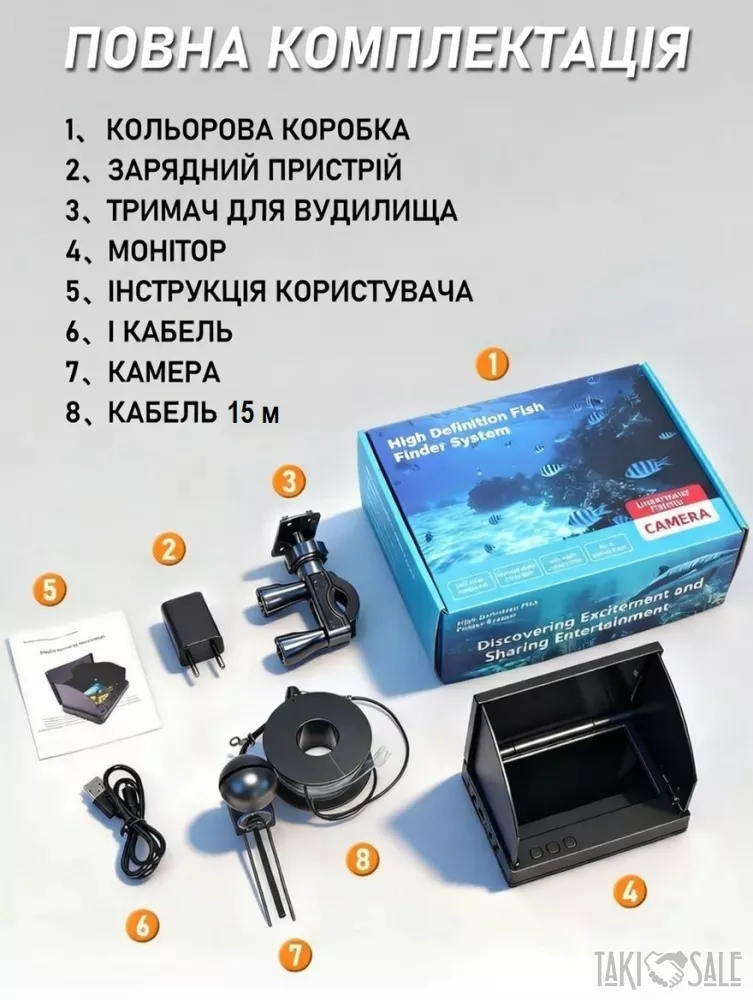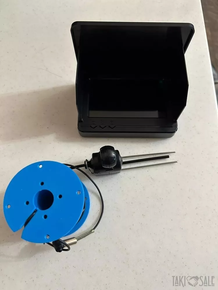 Комплектация включает все аксессуары: барабан для кабеля, крепление на удочку, поплавок, зарядку.