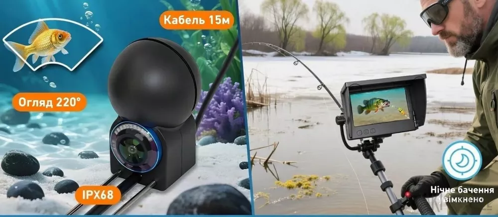 Широкий угол обзора 220° охватывает максимальную площадь дна, яркость 1500 люменов гарантирует качественную картинку на глубине до 15 метров.