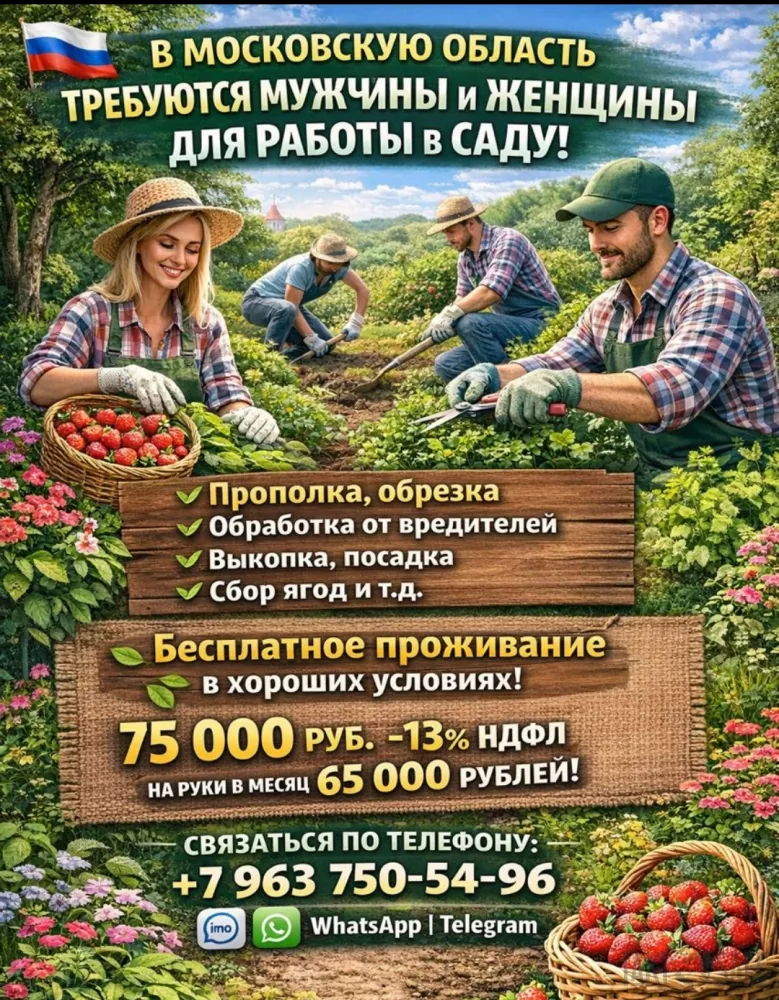 В Московскую область Требуются мужчины и женщины для работы в саду (прополка, обрезка, обработка от вредителей, выкопка, посадка, сбор ягод и тд,).