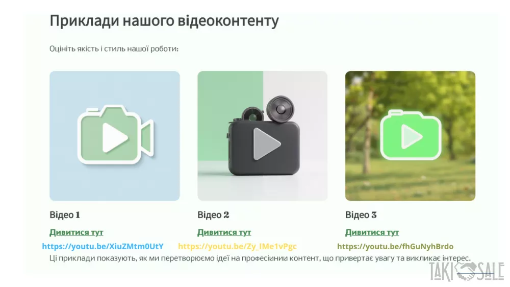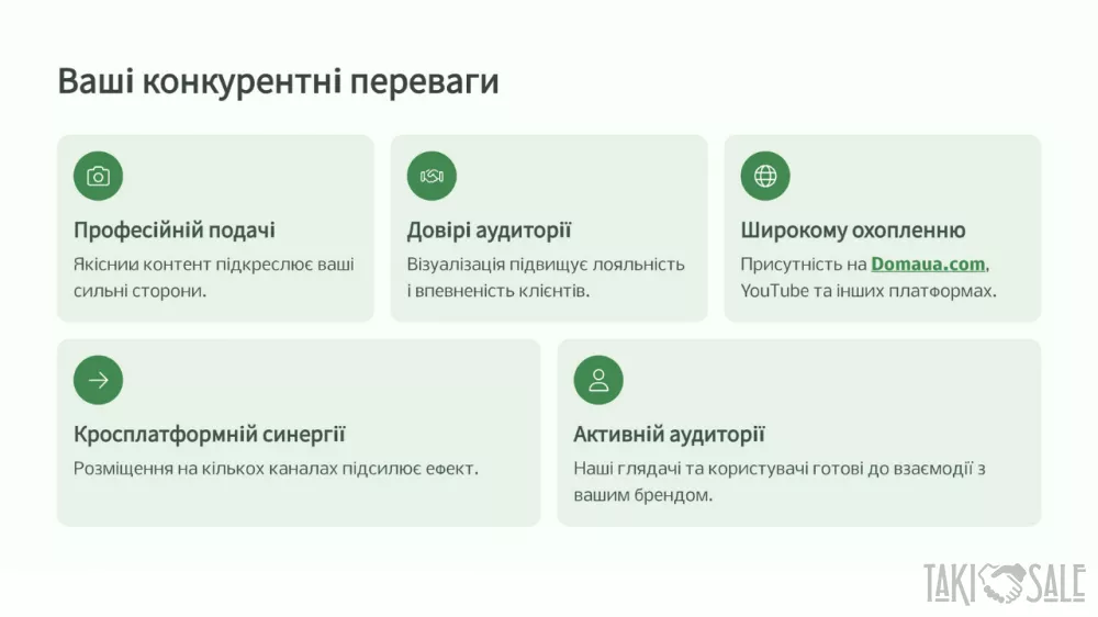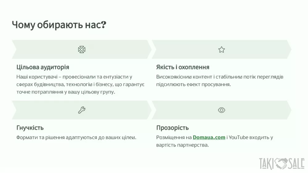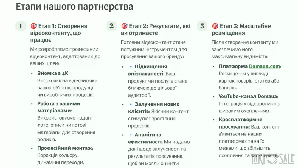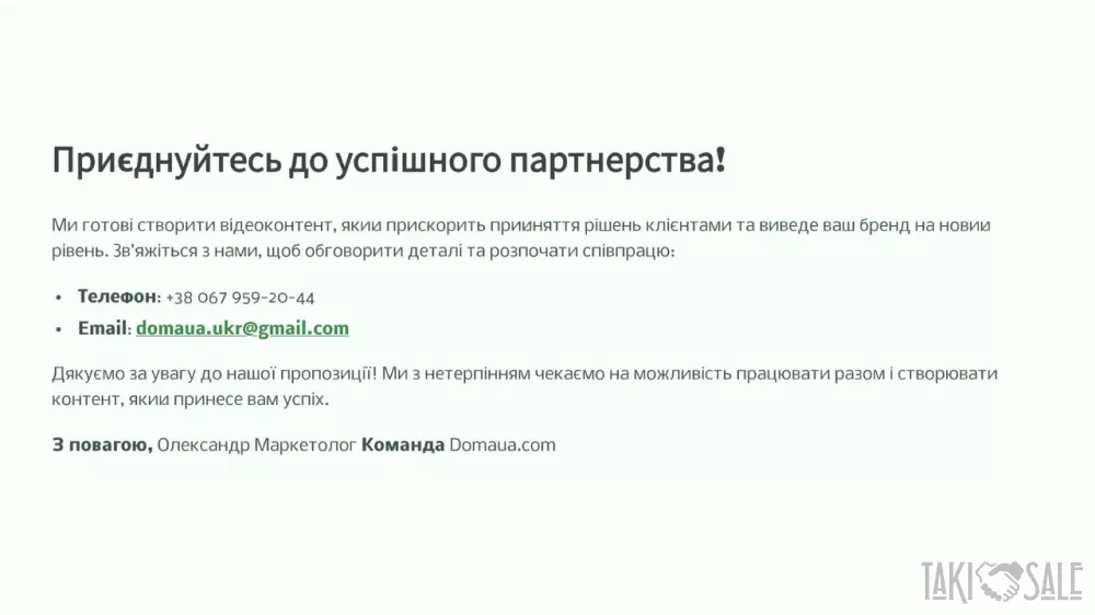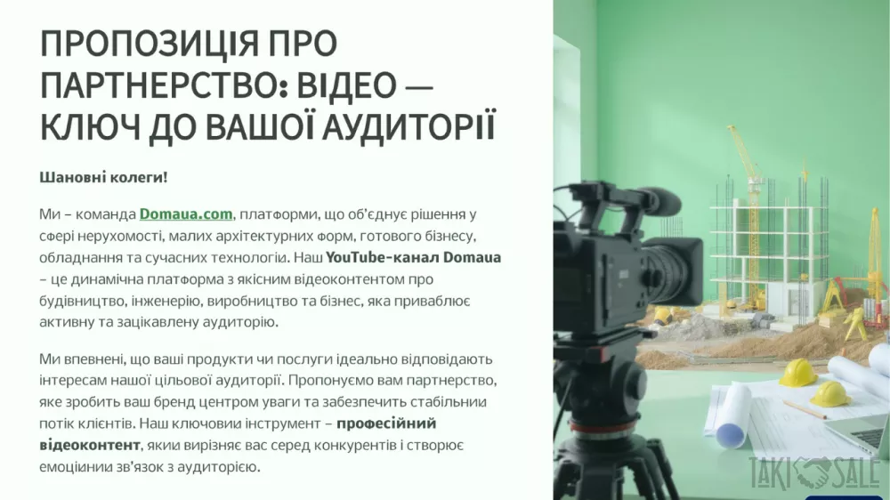 Ласкаво просимо до DomaUA! DomaUA — це інноваційна онлайн-платформа, що відкриває нові горизонти для продажів через відео-контент на domaua.com та YouTube-каналі DomaUA. Ми створюємо унікальні можливості для партнерів, поєднуючи сучасні технології, професійний підхід до контенту та широку аудиторію. Хто ми? DomaUA — це екосистема для ефективного продажу: Нерухомості та будівель Готових бізнесів Інженерних систем Будівельних матеріалів Наші активи: Власний YouTube-канал із якісним відео-контентом Сайт domaua.com для зручного доступу до пропозицій Активні соціальні мережі для максимального охоплення Професійна медіа-студія для створення та монтажу відео Що ми пропонуємо? Ваша продукція → Наше відео Ми створюємо професійний відео-огляд вашої продукції, який підкреслює її переваги та привертає увагу цільової аудиторії. Розміщення контенту Ваше відео розміщується на платформі domaua.com та YouTube-каналі DomaUA, що забезпечує максимальну видимість і залучення потенційних клієнтів. Збір заявок Ми отримуємо запити від зацікавлених покупців і передаємо їх вам для подальшої обробки. Ваш успіх — наша комісія% Ви продаєте продукцію, а ми отримуємо відсоток від угоди як комісію. Проста та прозора модель співпраці! Переваги для вас: Готовий професійний відеоконтент Отримуйте якісні відео, створені нашою медіа-студією, які ефективно презентують вашу продукцію. Зростання впізнаваності бренду Розміщення на популярних платформах і в соціальних мережах підвищує видимість вашого бренду та залучає нових клієнтів. Оплата тільки за результат Ви платите лише за успішні угоди, що мінімізує ваші ризики та робить співпрацю вигідною. Приклад відео: Ознайомтеся з прикладом нашого відео: Переглянути на YouTube   Ссылка на видео: https://youtu.be/XiuZMtm0UtY Станьте нашим партнером сьогодні! Зв’яжіться з нами, щоб обговорити деталі співпраці та почати створювати ефективні відео-продажі: +38 (067) 959-20-44 +38 (050) 056-63-26 domaua.ukr@gmail.com DomaUA.com З повагою, Олександр DomaUA — ваш ключ до успішних продажів через відео! Приєднуйтесь зараз і почнімо працювати разом! Ссылка на видео: https://youtu.be/XiuZMtm0UtY