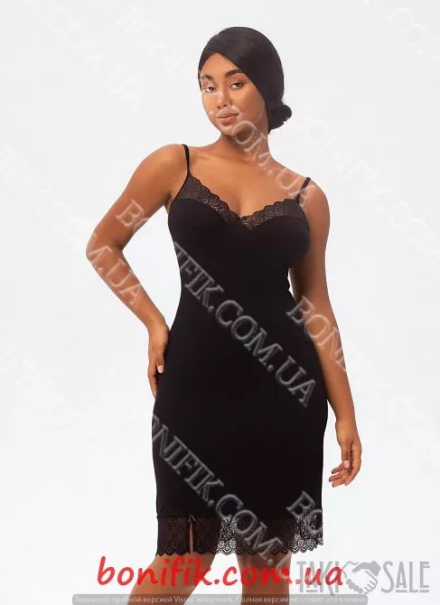 Має прилягаючий фасон, з глибоким вирізом в зоні грудей. Декольте та низ сорочки доповнює привабливе мереживо.