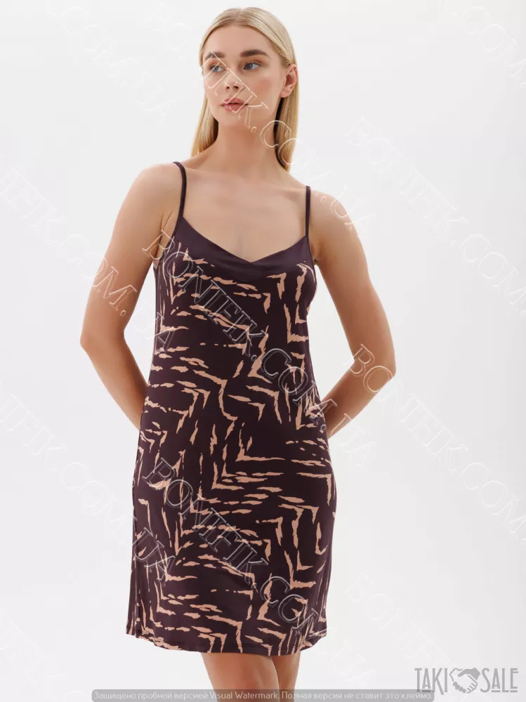 Нічна сорочка довжиною вище коліна, представлена в коричневому кольорі, на тонкій бретелі.