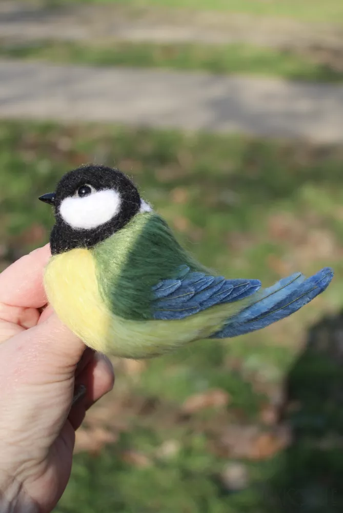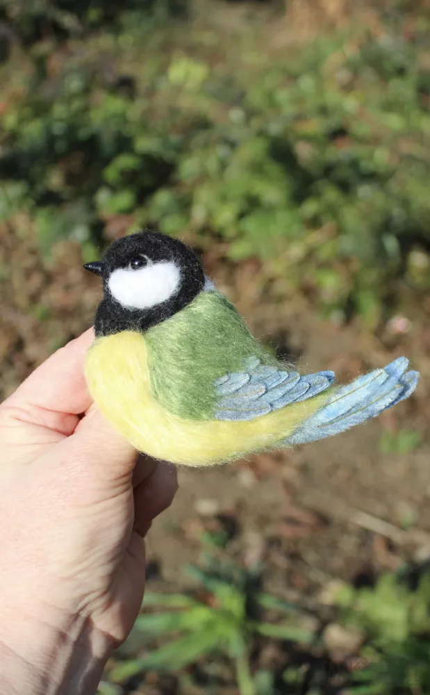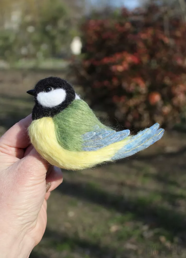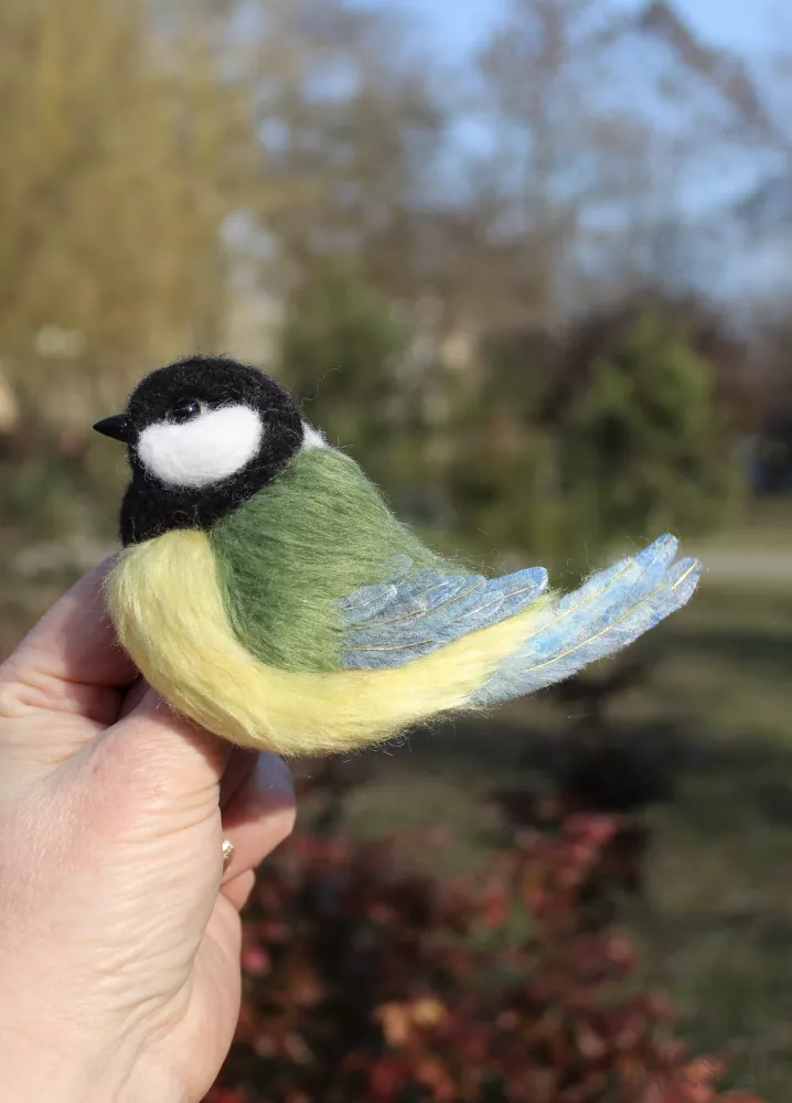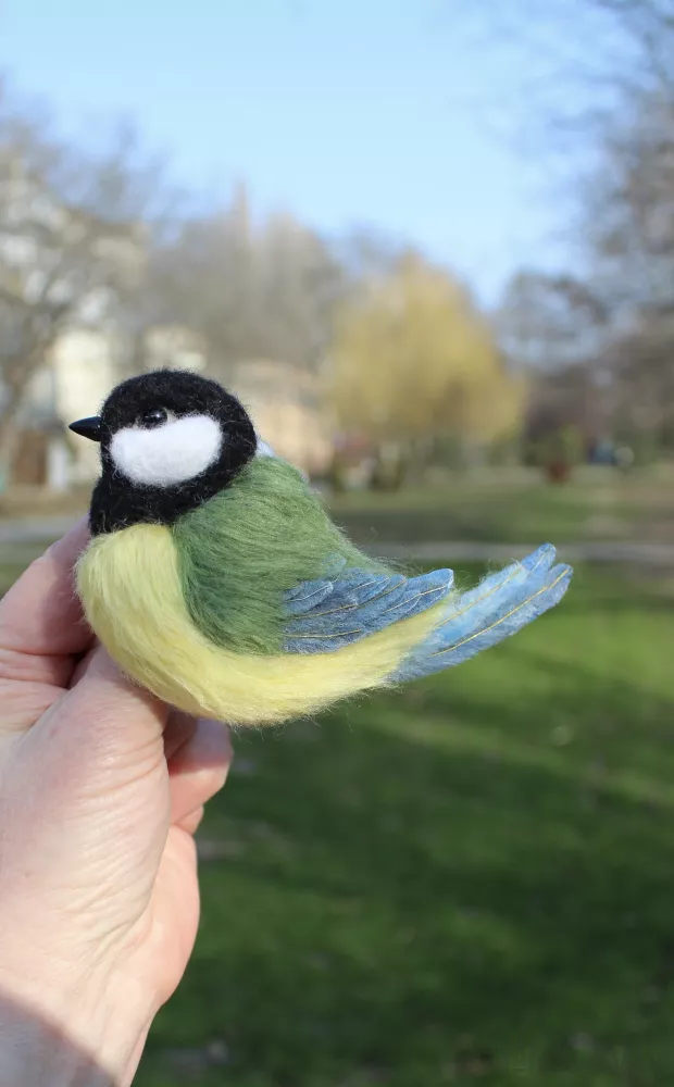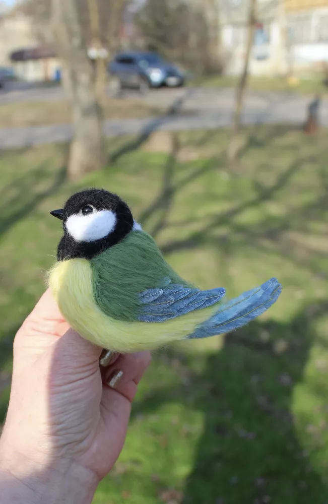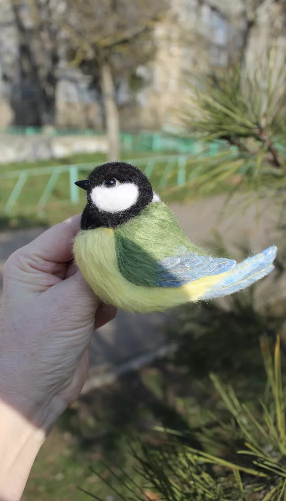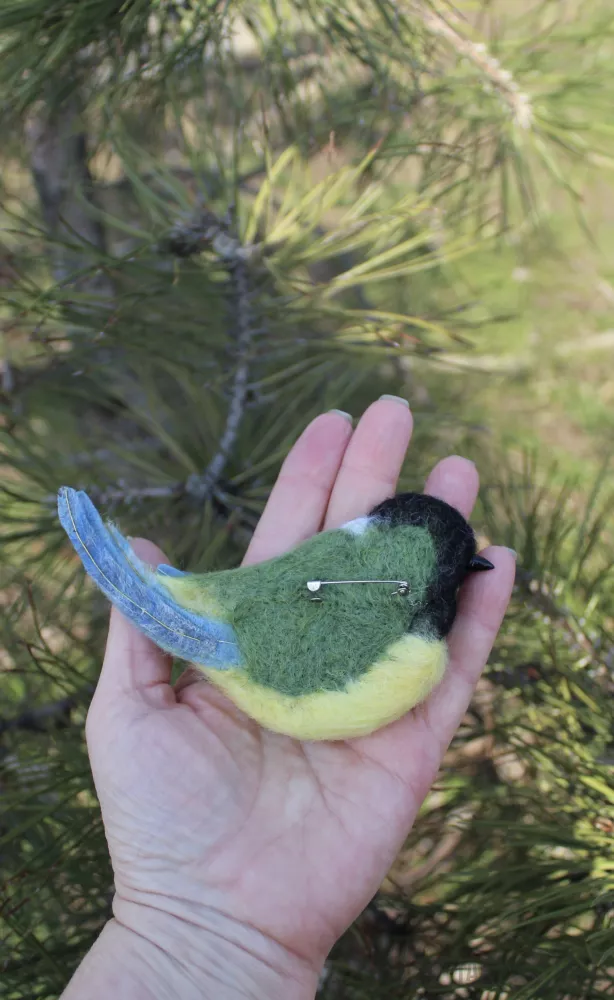 Валяна з шерсті брош синичка прикраса войлочная. Реалістична птичка синиця хендмєйд . Дуже блискуча красунечка . Висота 8,5 см, длина 13,5 см. Кожне перо зроблено окремо, клювик ручної лепки та розпису. Брошечка синичка буде пасувати як на одягу так і на сумочці, рюкзачку. Також можна і для прикраси інтерʼєру , як інтерєрну іграшку використовувати. Чекає новий будиночек. Гарний подарунок та прикраса вашого інтерʼєру на довгі роки.