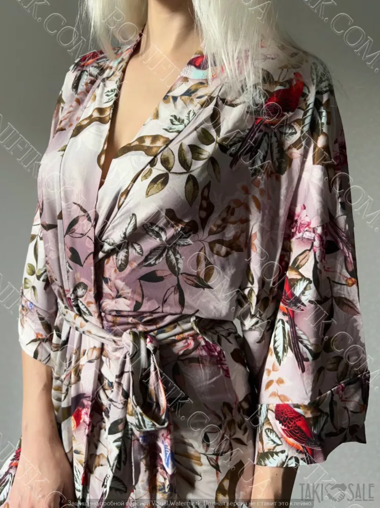 Жіночий халат виконаний із якісної віскозної тканини дикорованої квітковим принтом.