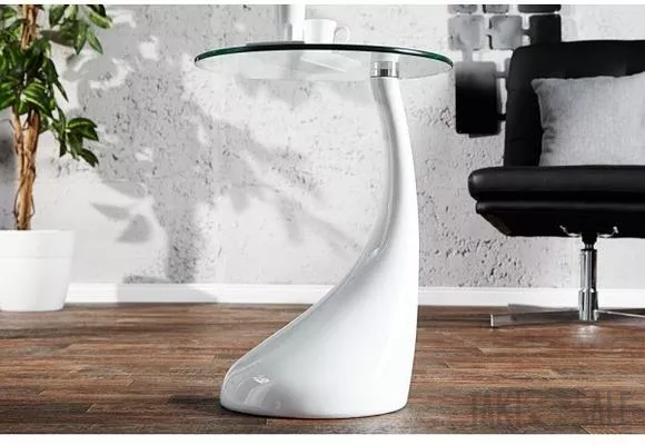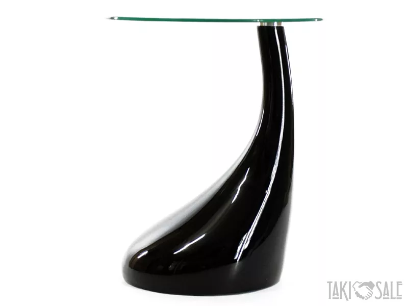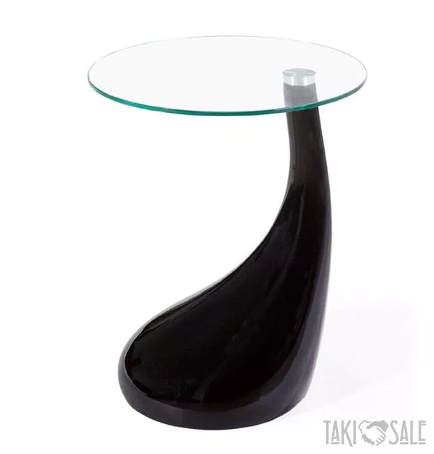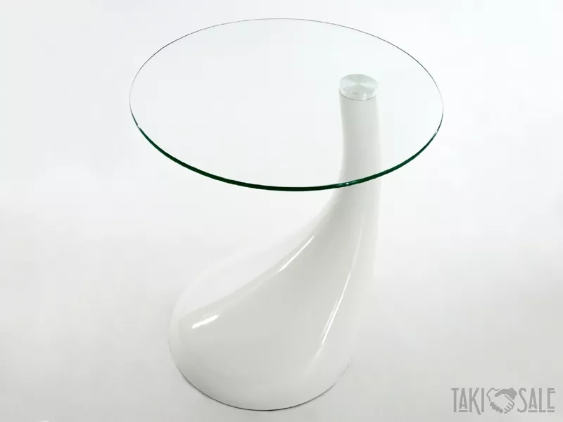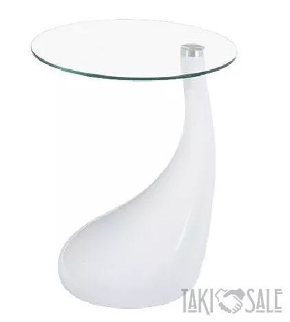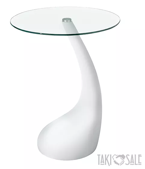 Столик круглий, стільниця з загартованого прозорого скла на декоративної зігнутої пластикової ніжці у вигляді краплі, матеріал основи пластик поліпропілен, діаметр стільниці 50, висота столу 50 см.