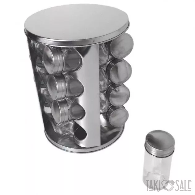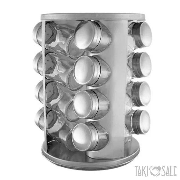 Набор для специй с подставкой представляет собой стойку из нержавеющей стали с 16 ёмкостями. Металлическая поверхность стойки имеет матовую полировку.