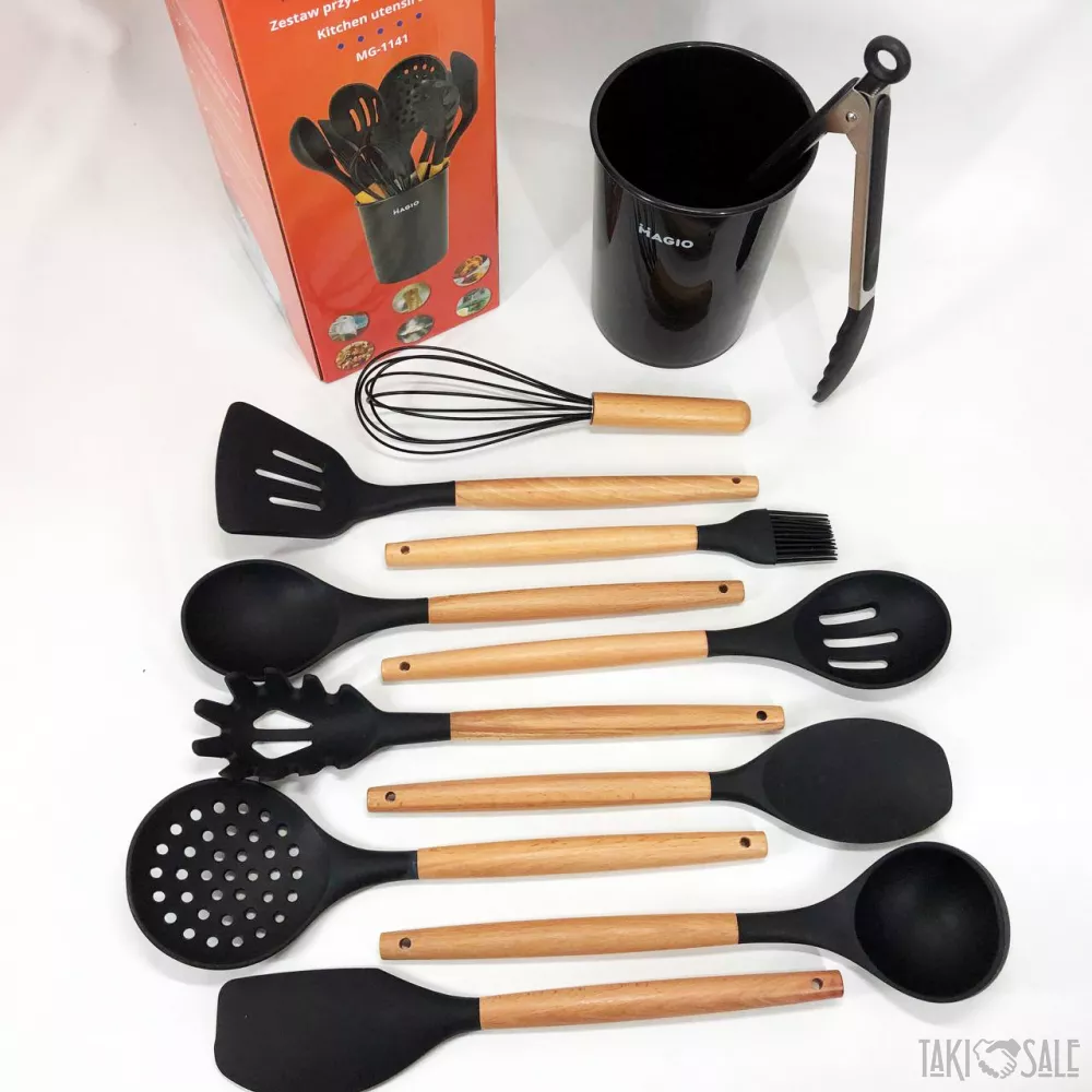 Набор кухонный из 11 силиконовых предметов MG-1141 – незаменимый надежный помощник на Вашей кухне, является 11 необходимыми предметами для каждой хозяйки и ведерко для хранения. На дне ведерка есть отверстие, которое обеспечивает сухость всех аксессуаров, а также предотвращает образование слизи и плесени