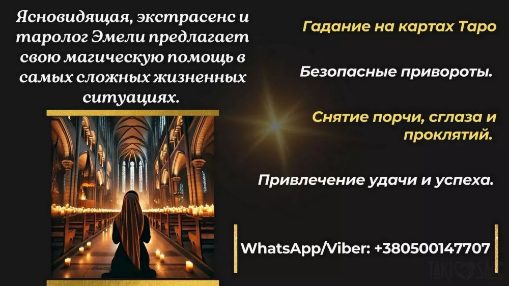 Вы читаете это не случайно — возможно, именно сейчас вам нужна поддержка и ответы на важные жизненные вопросы. Эмели — ясновидящая, экстрасенс и таролог с многолетним опытом — предлагает помощь в трудных ситуациях. Её способности помогают людям лучше понять себя, вернуть гармонию в отношения, защититься от негатива и наладить свою жизнь.