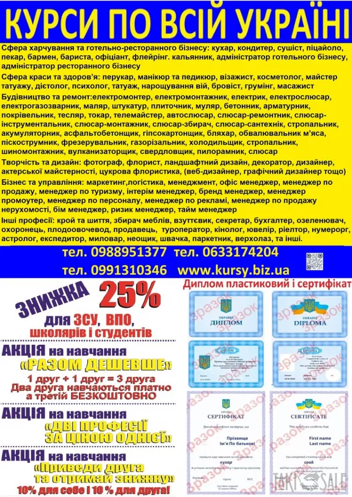 Курси кухар, перукар, зварник, перукар, манікюр, електрик,слюсар