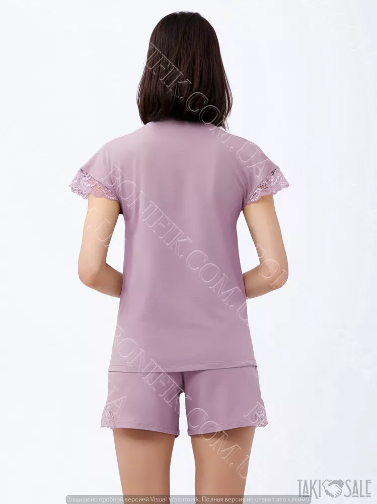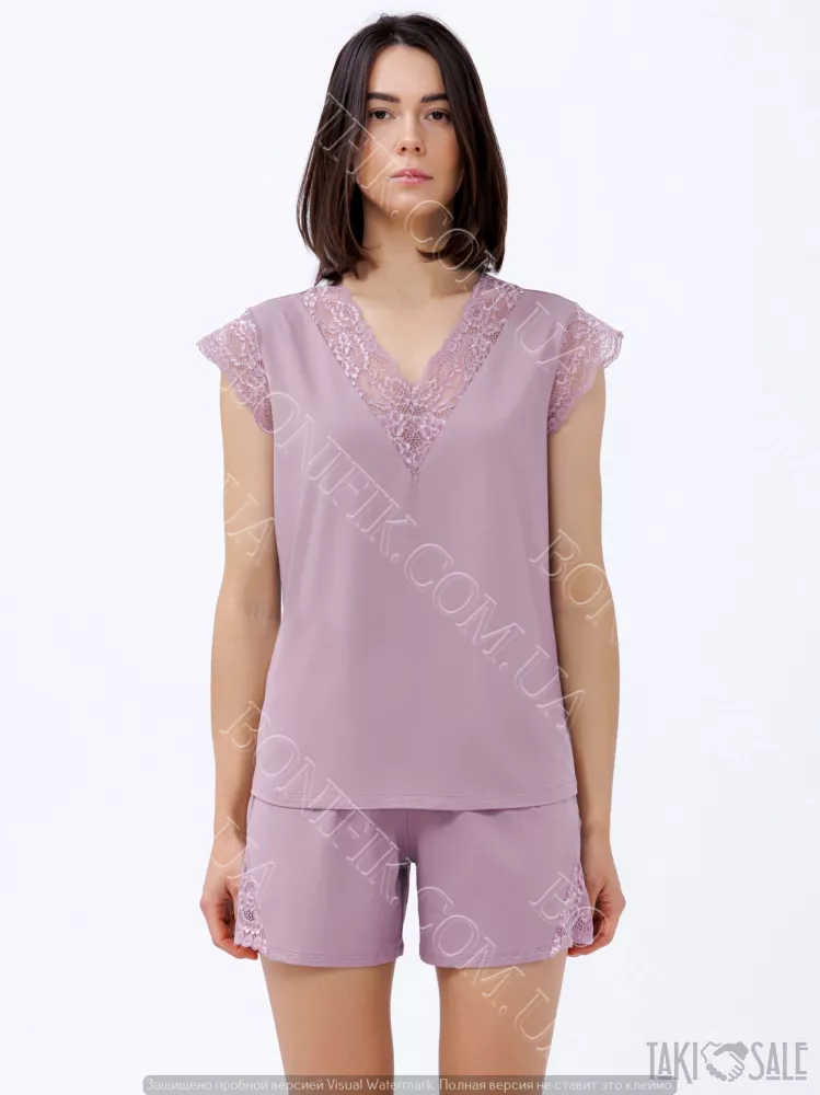 Комплект складається з футболки приталенного крою, з короткими рукавами із мережива та мереживними вставками в зоні декольте.