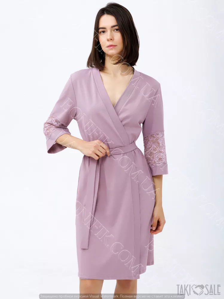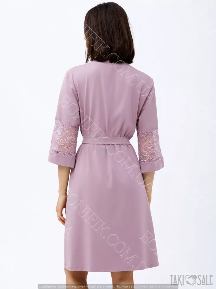 Модель халату зав'язується на пояс, з рукавами довжиною 3/4 прикрашені мереживними вставками.