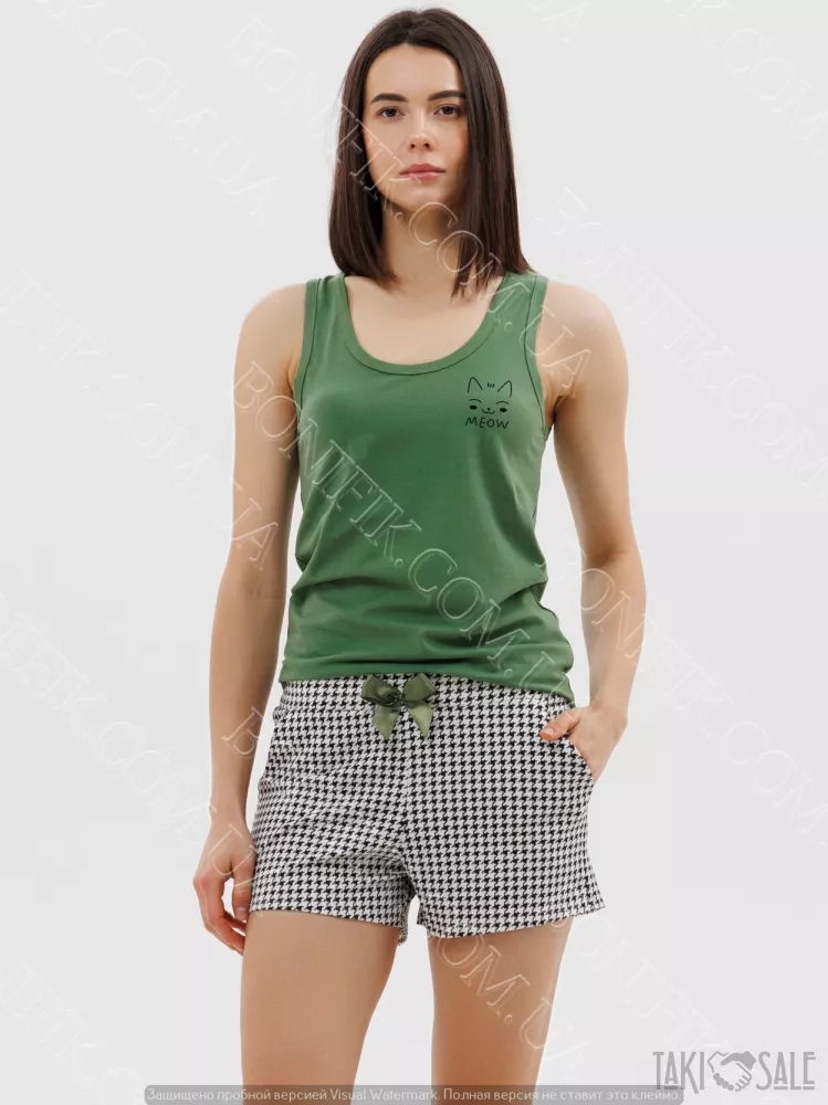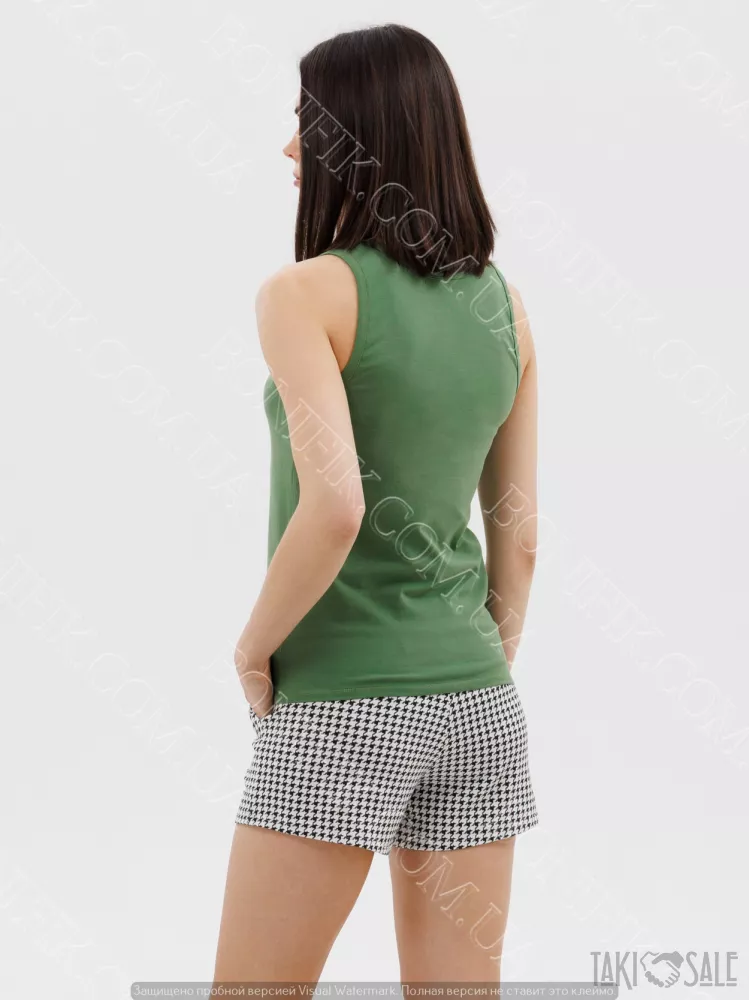 Комплект складається з майки яскравого зеленого кольору та комфортних шортиків. Майка на широких бретелях і круглим вирізом.