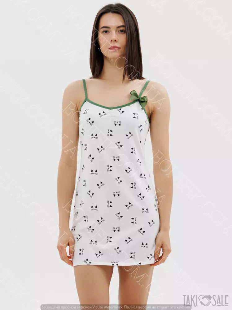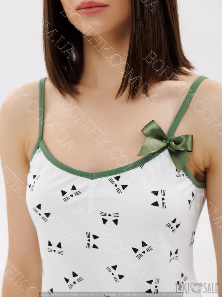 Модель сорочки виконана на тонких бретелях зеленого кольору, декорована принтом котики, середньої довжини, має напівприлягаючий силует.
