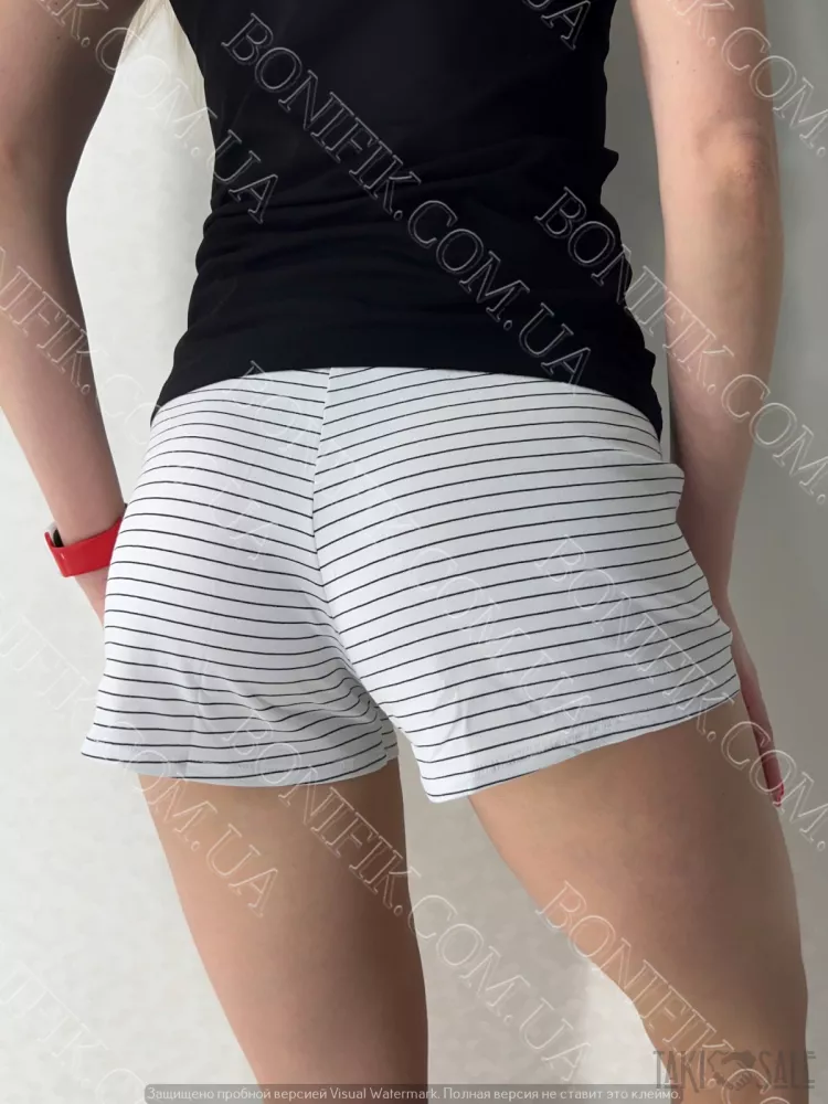 Шорти з м'якою резинкою на поясі, боковими кишенями, мають біле забарвлення і декоровані принтом тонкої чорної смужки. Ширина шорт регулююється внутрішнім шнурком.