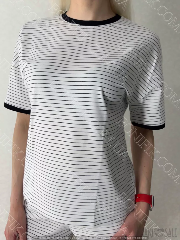 Комплект із бавовняної тканини колекції «Strip Life» складається із футболки з коротким рукавом і шортиків. Піжама представлена в білому кольору і прикрашена малюнком «тонка смужка».