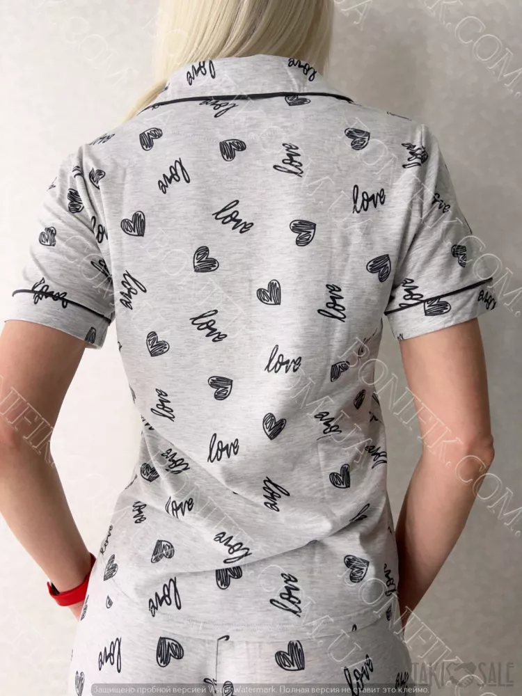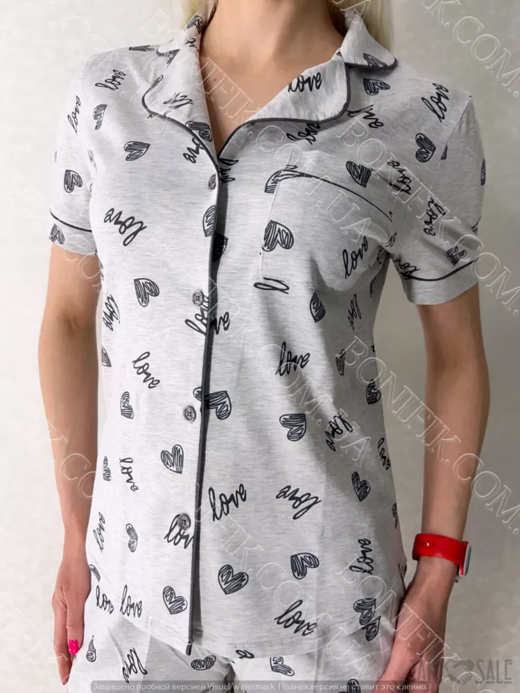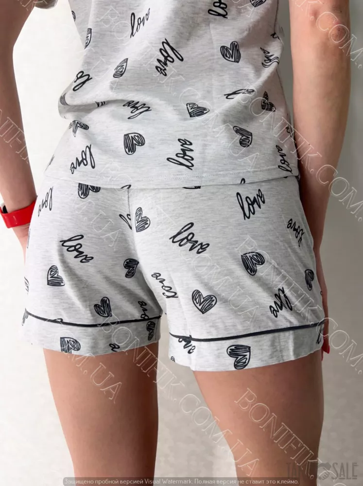 Жіноча піжама із бавовни сірого кольору з оптимальним вплетінням еластану. Піжама складається із сорочки і шорт прямого силуету, прикрашена принтом «сердечок» і написів «LOVE».