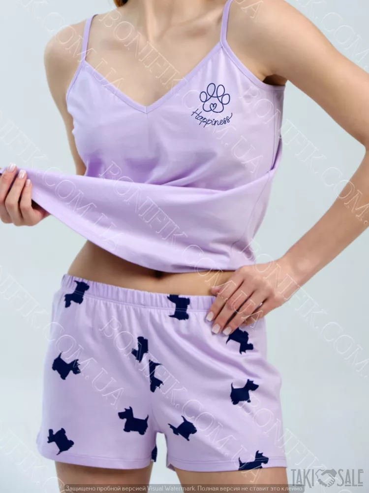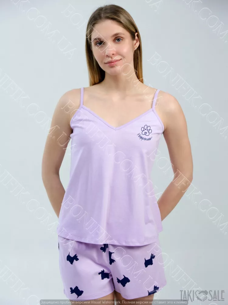 Легка, ніжна та зручна - жіноча піжама із колекції «Lavender Puppies» на тонких бретелях створена для вашого комфорту в теплі дні та затишні домашні вечори.
