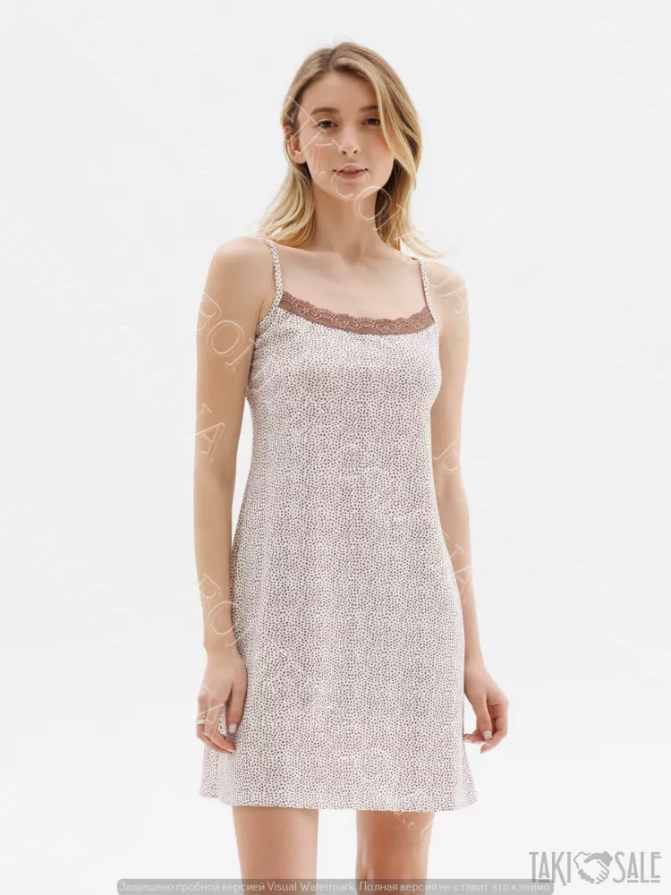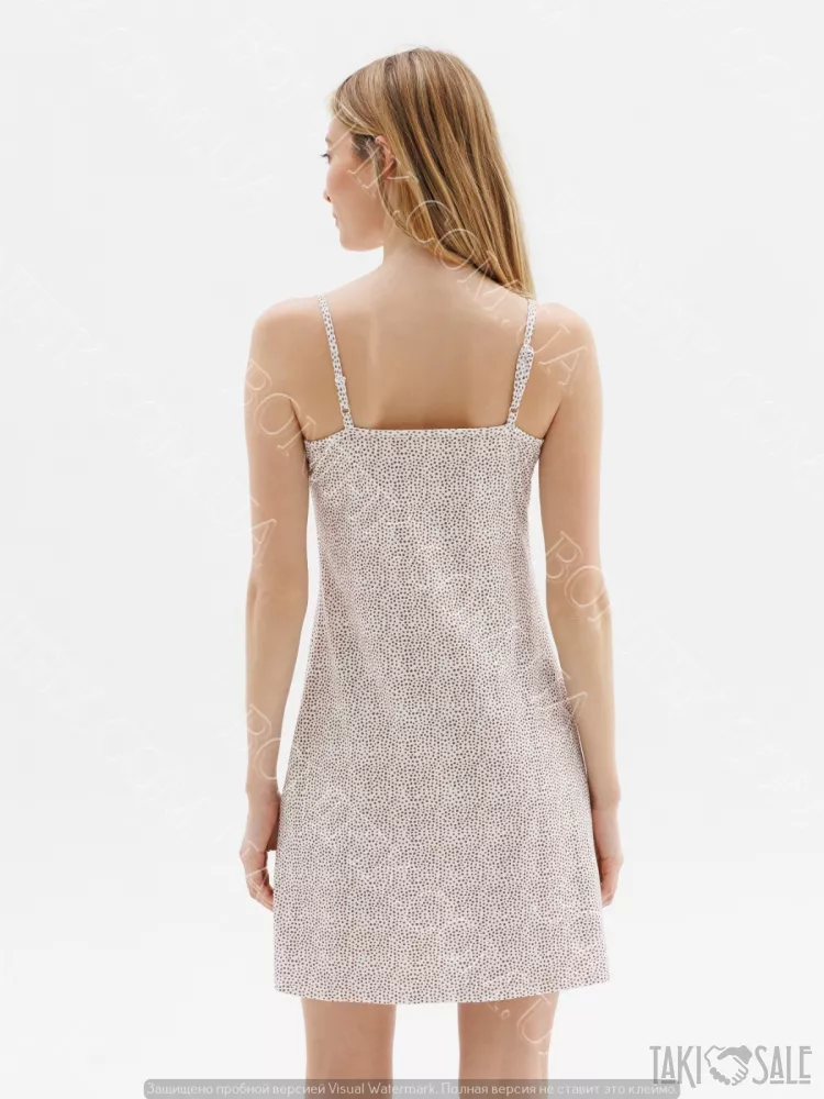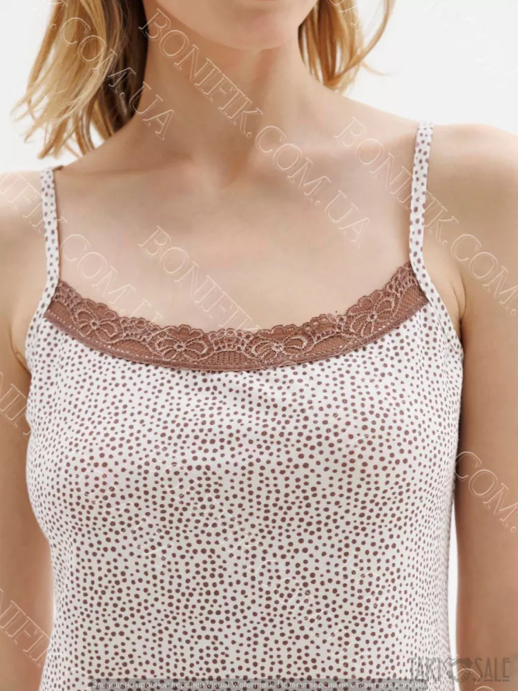Має бежевий з мілким темно-коричневим принтом у виді крапок (або мініатюрних візерунків), вузькі регулюючи бретелі.