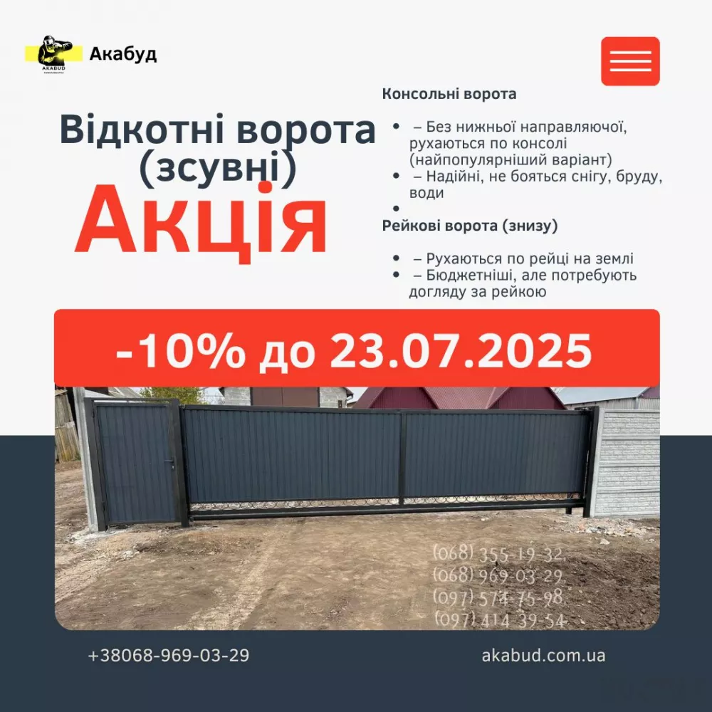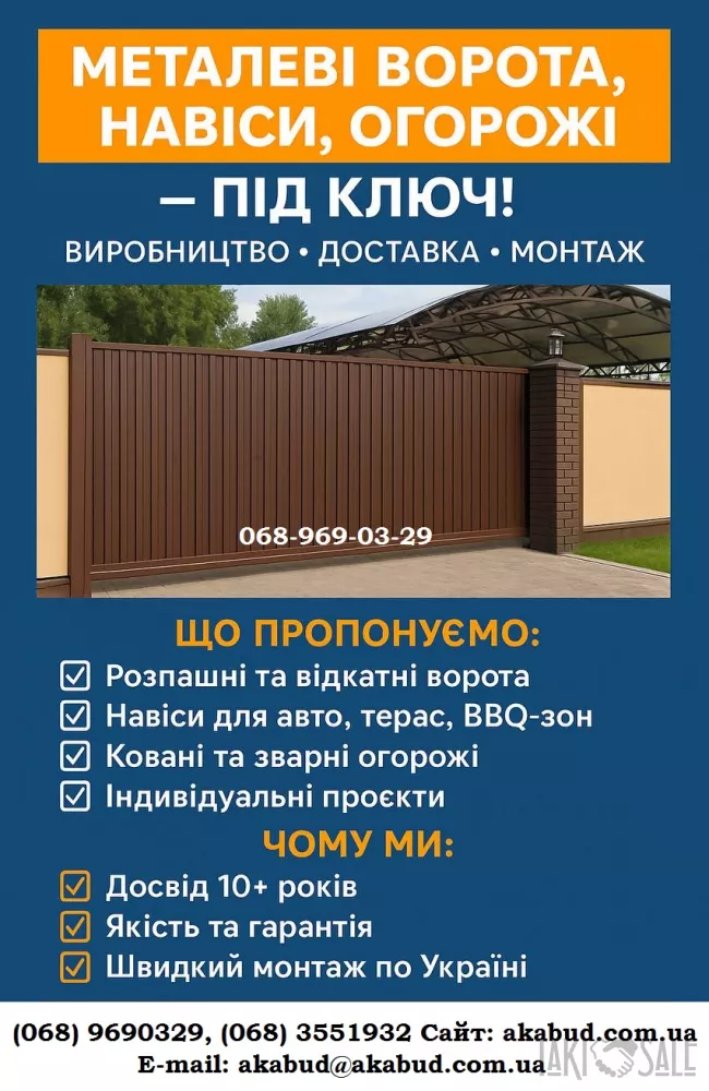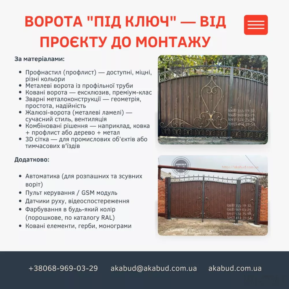 Откатные ворота. МАФы. Козырьки. Ворота. Заборы. Навесы. Изготавливаем и монтируем конструкции любой сложности по всей Украине Ворота Распашные. Откатные (сдвижные). Со встроенной калиткой. С автоматикой Калитки Профнастил, ковка, 3D-сетка, жалюзи