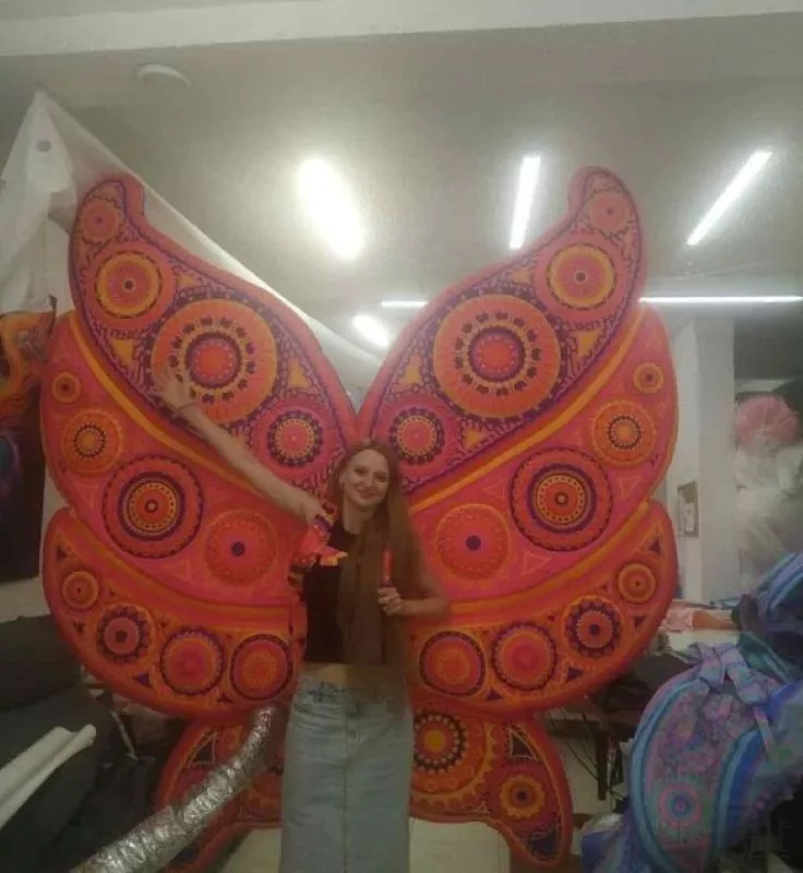 Надувные крылья бабочки изготовлены из полиэстера с полиуретановым покрытием, ткань огнестойкая, грязеотталкивающая. Пыль с надувного изделия удаляется влажными салфетками.
