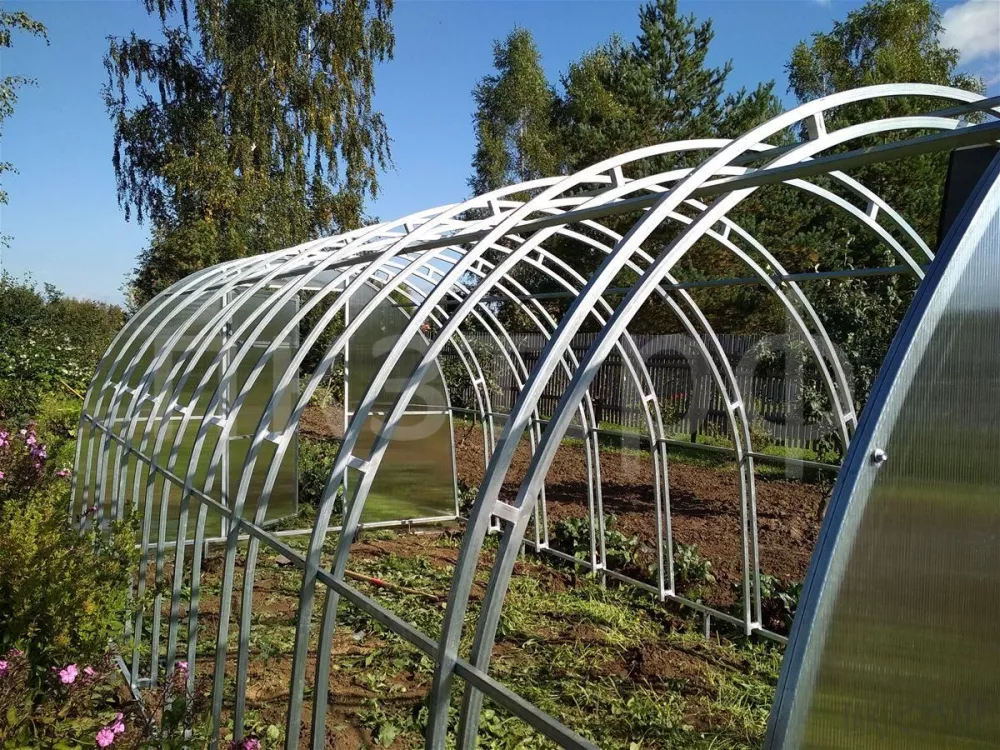 Арочные, прямостенные. Ширина теплиц 2,3,4 и 5 метров. Стоимость с учетом поликарбоната. Цельносварные оцинкованные дуги. Дуга 20х20мм, 25х25мм, двойная дуга.