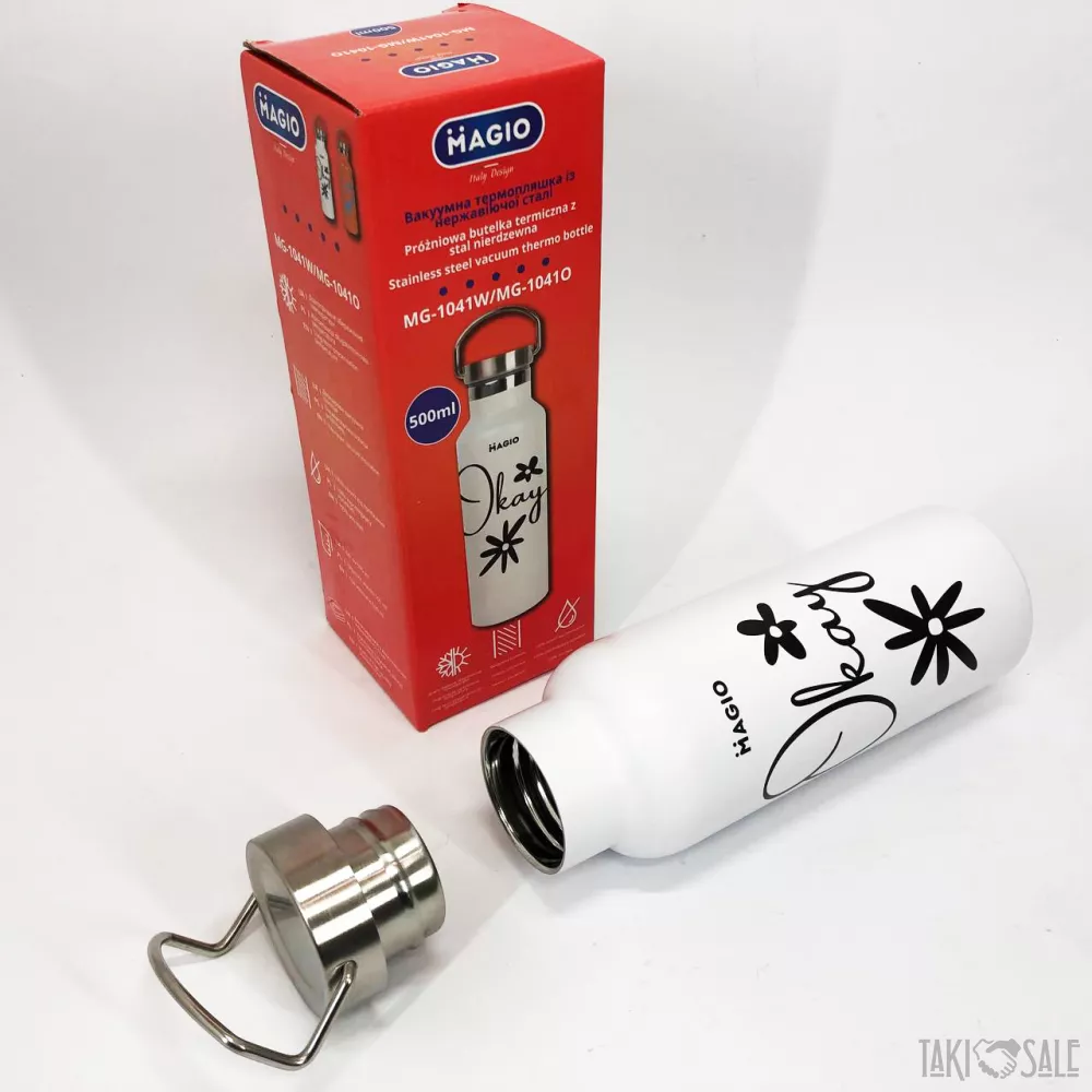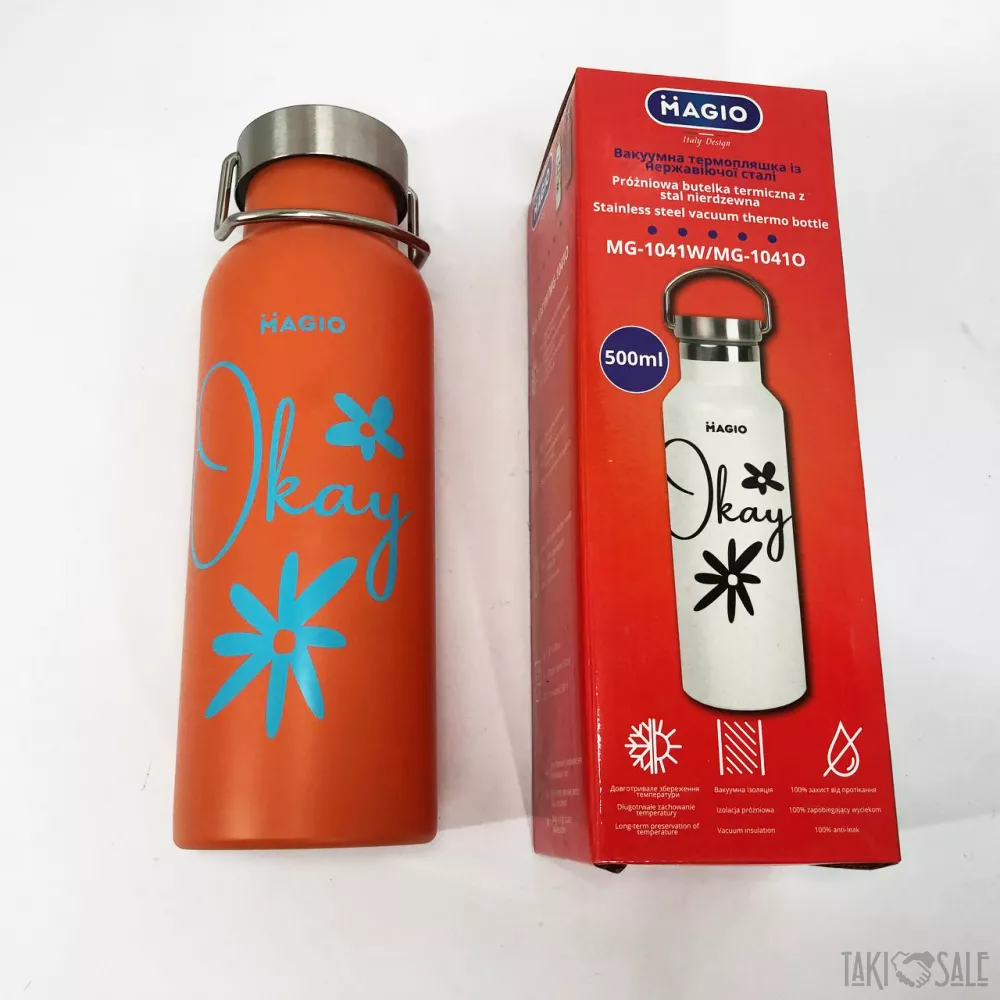 Термобутылка Magio изготовлена из нержавеющей стали, для удобства имеет нескользящую прорезиненную вставку на корпусе, долго сохраняет температуру.