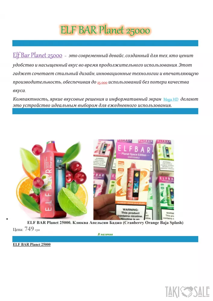 Elf Bar Planet 25000 это современный девайс, созданный для тех, кто ценит удобство и насыщенный вкус во время продолжительного использования. Этот гаджет сочетает стильный дизайн, инновационные технологии и впечатляющую производительность, обеспечивая до 25 000 использований без потери качества вкуса.