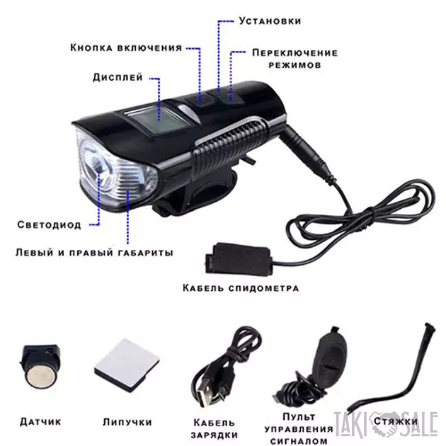 Велофара с компьютером и сигналом T6+2LED с выносной кнопкой на руль