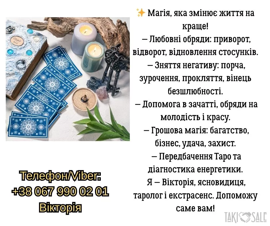 Мене звати Вікторія. Я ясновидиця, екстрасенс, рунолог і таролог. Вже багато років я допомагаю людям знаходити відповіді на найскладніші питання, змінювати долю і відкривати нові шляхи до щастя.