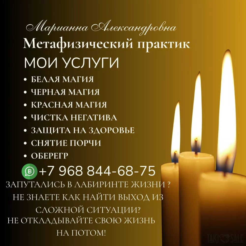 Маг Марьяна Александровна – Ваш ключ к решению любых жизненных ситуаций! Приветствую вас! Если вы ищете ответы на сложные вопросы, столкнулись с необъяснимыми трудностями или нуждаетесь в помощи опытного практика, я, Маг Марьяна Александровна, готова вам помочь. Владею мощными техниками и знаниями в области магии, включая: Красную магию (для привлечения любви и страсти) Белую магию (для гармонии и исцеления) Чёрную магию (в сложных и запутанных ситуациях) Магию Вуду (для достижения поставленных целей) Предлагаю широкий спектр магических услуг: Ритуалы и обряды на удачу, любовь, деньги Изготовление индивидуальных амулетов и оберегов для защиты и привлечения желаемого Не откладывайте свою жизнь на потом! Пришло время действовать и изменить свою судьбу к лучшему. Обращайтесь за консультацией, и я помогу вам найти выход из любой ситуации.Запись на консультацию: +7 968 844‑68‑75 WhatsApp