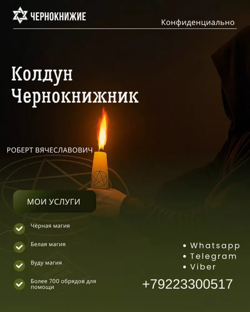 🔮 Колдун Чернокнижник Роберт Вячеславович – Ваш Проводник в Мир Магии (Опыт 18 лет) 🔮 Устали от пустых обещаний и шарлатанов? Обратитесь к опытному колдуну и чернокнижнику Роберту Вячеславовичу, практикующему обрядовую магию уже 18 лет! Я не ведаю – я ЗНАЮ, как решить ваши проблемы! Мои услуги: Любовная магия: Привороты, отвороты, гармонизация отношений, возврат любимых, устранение соперников. Денежная магия: Привлечение удачи в бизнесе, открытие денежных каналов, снятие финансовых блоков, ритуалы на богатство. Магия Вуду: Мощные ритуалы для достижения ваших целей, подчинение воли, наказание обидчиков. Снятие негатива: Избавление от сглаза, порчи, проклятий, родовых проклятий, защита от темных сил. Поиск пропавших людей: Обладаю даром ясновидения и помогу найти ваших близких. Другие магические услуги: Индивидуальный подбор обрядов для решения любых жизненных ситуаций. Преимущества работы со мной: Опыт 18 лет в магии; Работаю по всему миру; Бесплатная консультация; Индивидуальный подход к каждому клиенту; Гарантия результата; Строгая конфиденциальность. Не тратьте время и деньги на шарлатанов! Обратитесь к настоящему профессионалу! Контакты: Телефон: +79223300517 (Whatsapp, Telegram, Viber) Ключевые слова: колдун, чернокнижник, маг, магия, любовная магия, денежная магия, магия вуду, приворот, отворот, снятие порчи, сглаз, проклятие, поиск пропавших, ясновидение, гадание, эзотерика, ритуалы, обряды, помощь мага, маг Роберт Вячеславович, магическая помощь, сильный маг, опытный колдун, Россия, Москва, онлайн консультация мага.