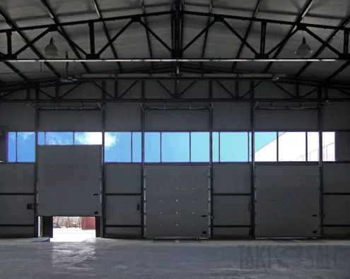 Особливості: Теплоізоляція (сендвіч-панелі), підйом полотна під стелю, що заощаджує простір всередині та зовні.