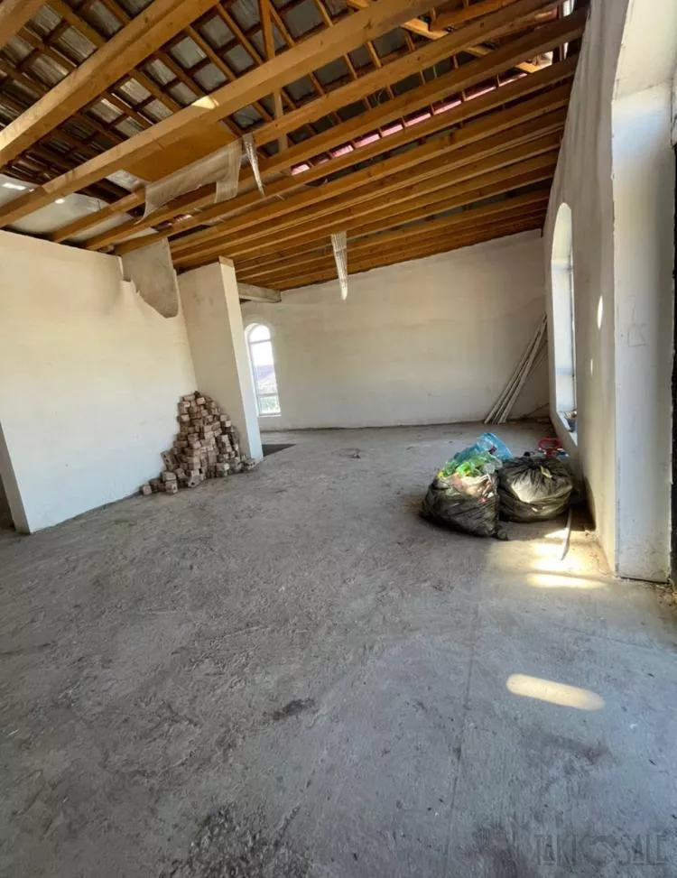 На первом этаже расположены комнаты с окнами арочной формы, добавляющими уникальный архитектурный элемент. На втором этаже установлены прямоугольные окна. Внутренняя отделка включает глянцевые натяжные потолки и стены с декоративной штукатуркой различных оттенков. Просторная кухня-гостиная с мебельным гарнитуром. Идеально подходит для большой семьи, обеспечивая комфорт и функциональность.