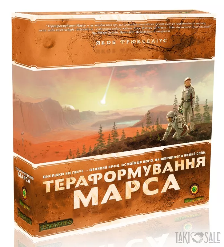 Гра Тераформування Марса - українська локалізація однієї з найкращих євростратегії останніх років Terraforming Mars, яка дає змогу гравцям очолити одну з великих корпорації, які починають освоєння червоної планети. Ваша мета - реалізовувати різні планетарні проекти, які поступово будуть перетворювати Марс на планету придатну для життя людини.