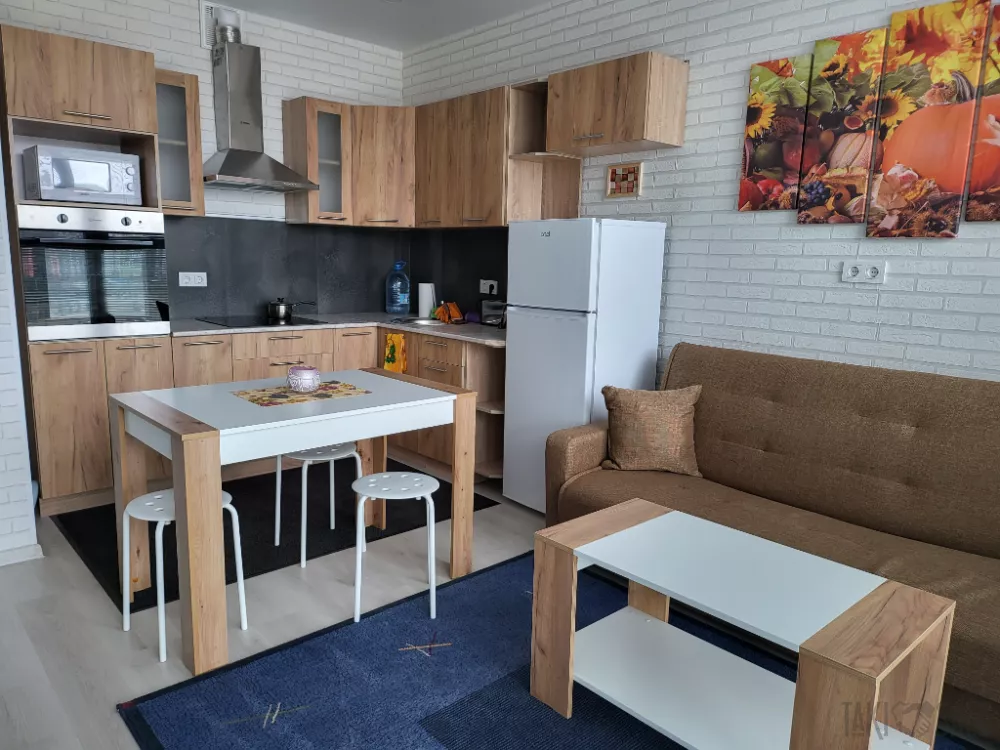 Просторная кухня совмещена с гостиной, что создает атмосферу открытости и свободы. Большие окна наполняют помещение естественным светом, а современная кухня оборудована всем необходимым: мебелью, встроенной техникой.