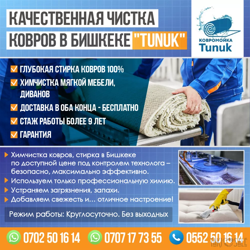 Качественная чистка ковров в Бишкеке «Tunuk» -Глубокая стирка ковров 100% -Химчистка мягкой мебели,диванов -Доставка в оба конца - бесплатно -Стаж работы более 9 лет -Гарантия