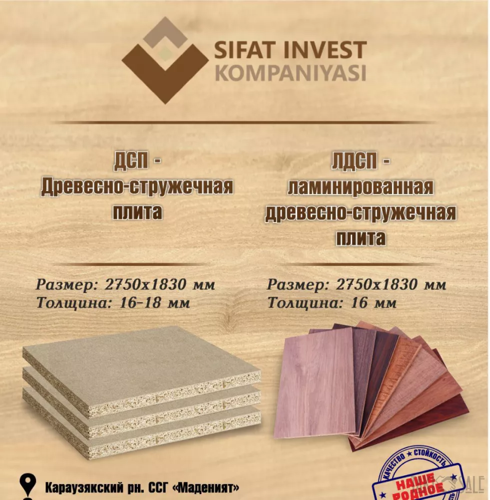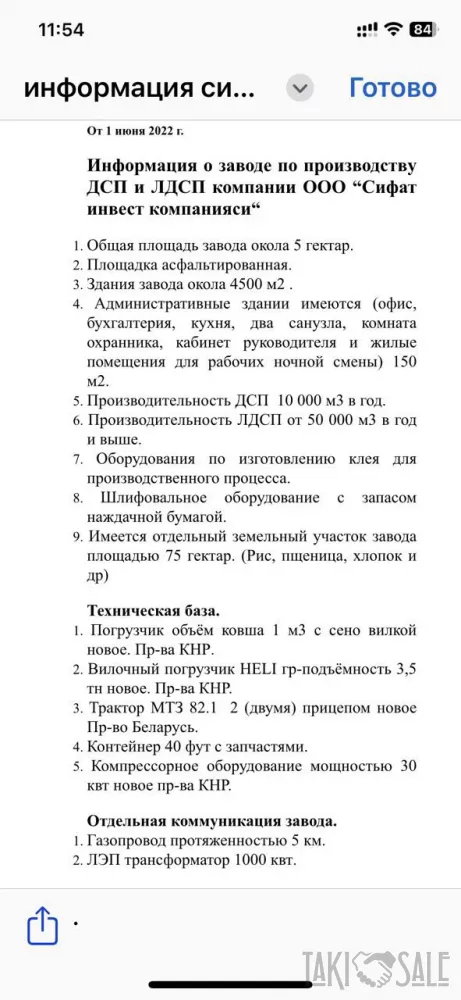 Действующее предприятие со всем необходимым оборудованием, техническим парком и собственной землей в 75 гектаров. В Узбекистане ДСП - импортируемый товар, пользуется большим спросом и имеет низкие производственные расходы.