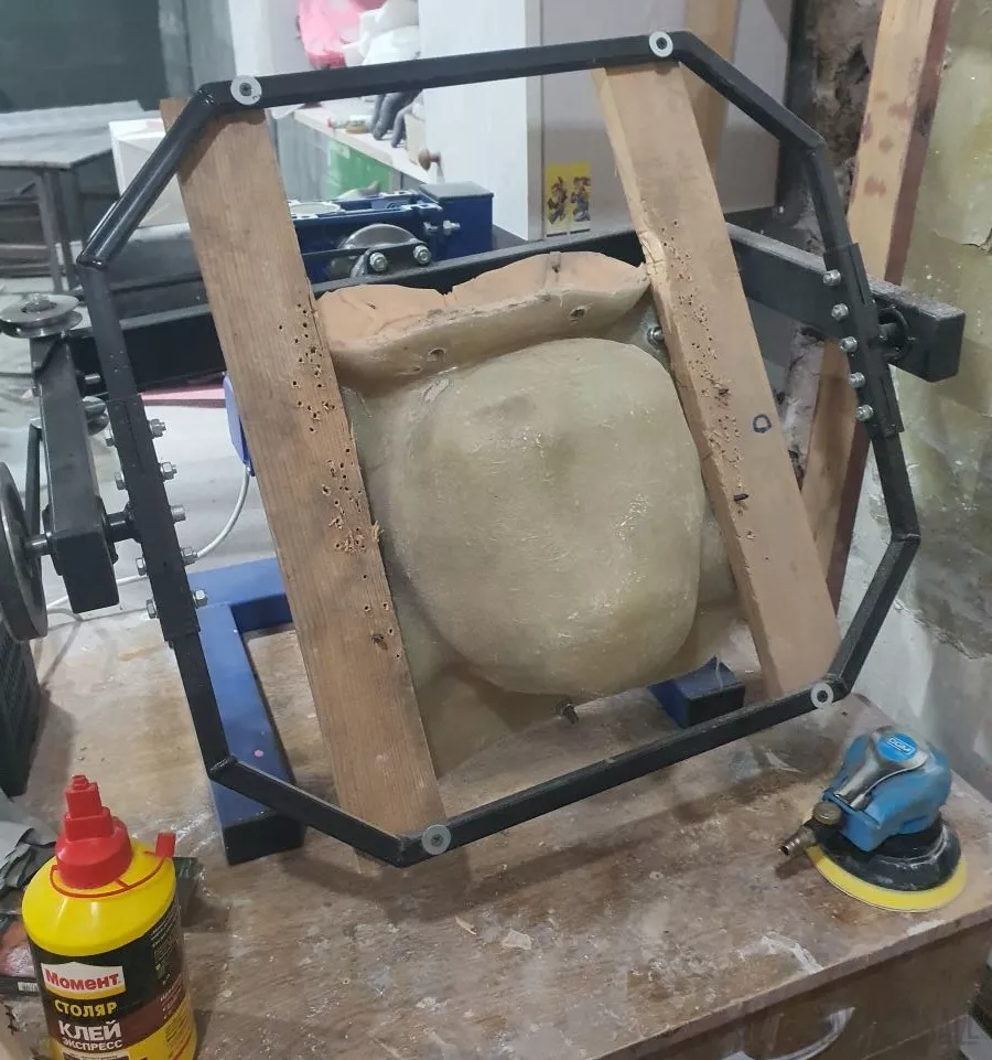 Форма закрепляется во внутреннюю раму, которая вращается в 2х плоскостях за счёт чего происходит равномерное пролитие смеси в форме.