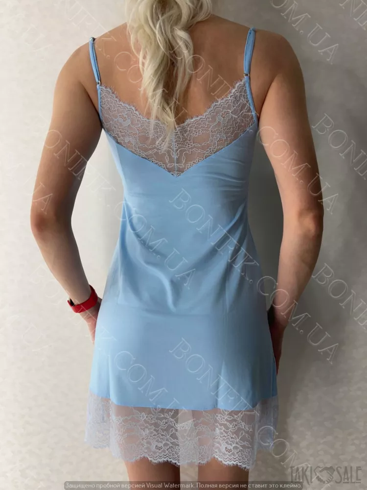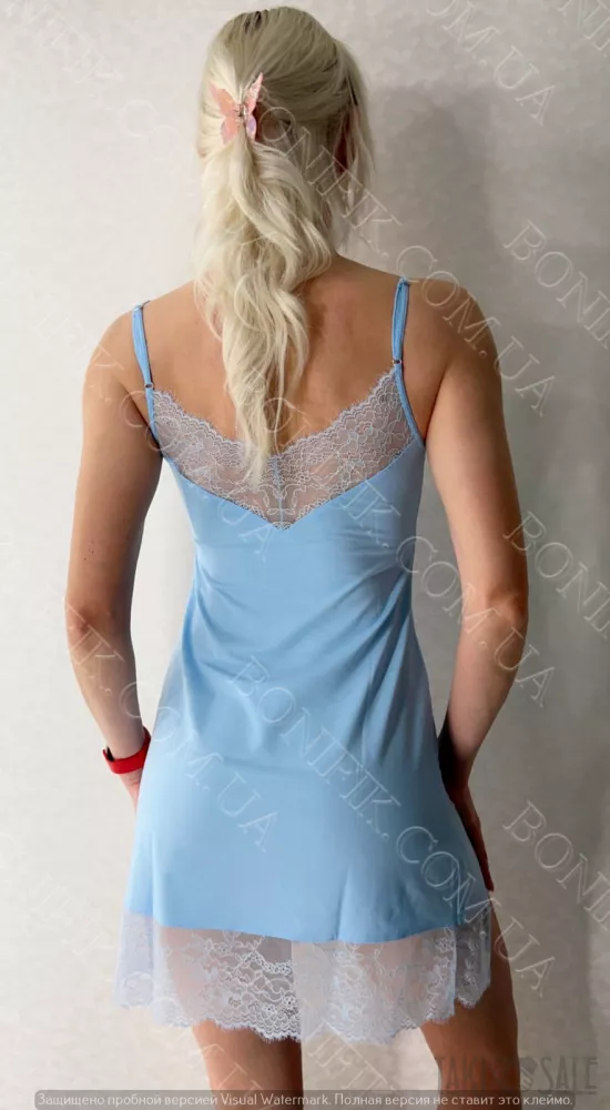 Легка тканина м'яко облягає фігуру, підкреслює її жіночні лінії. Глубокий V-подібний виріз декорований вишуканим мереживом, яке надає образу витончений і легкий шарм.