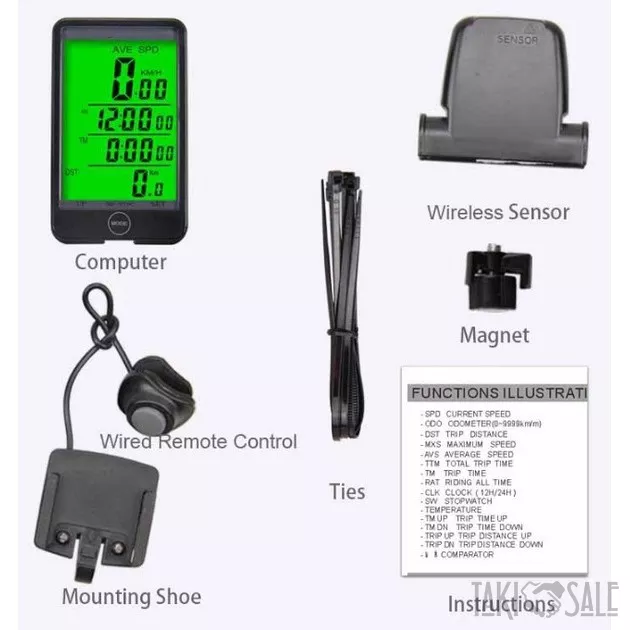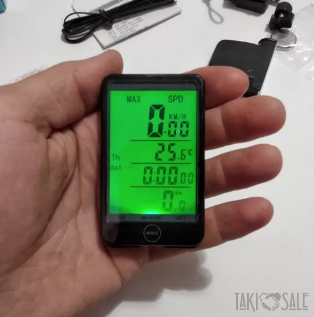 Беспроводной ,влагостойкий велокомпьютер, выносная кнопка для переключения режимов просмотра параметров, датчик километража,подсветка.