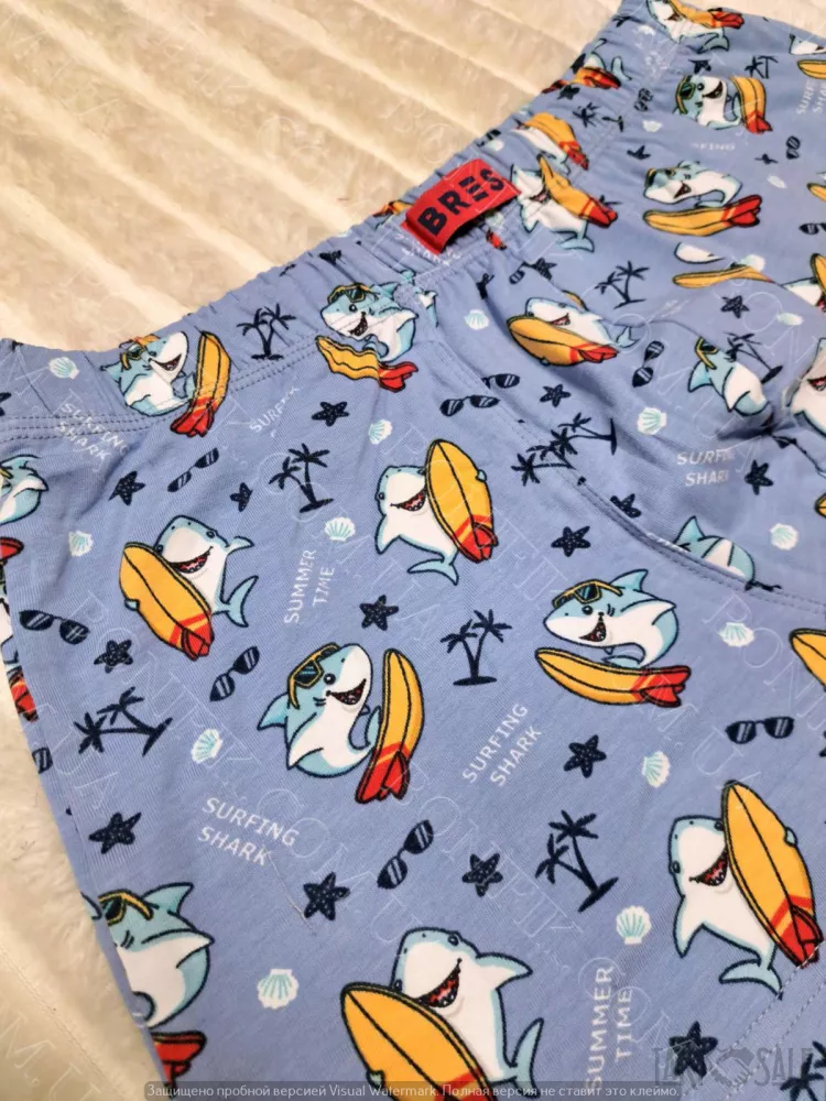 Блакитна тканина прикрашена яскравим літнім принтом – акули-серфінгісти, дошки, пальми і сонячні мотиви, що додають настрою і роблять білизну надзвичайною.