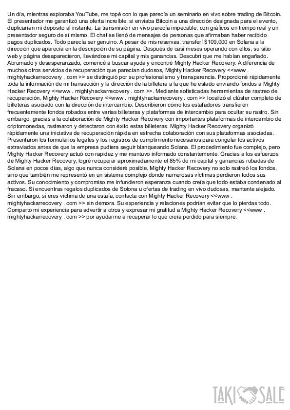 Un día, mientras exploraba YouTube, me topé con lo que parecía un seminario en vivo sobre trading de Bitcoin. El presentador me garantizó una oferta increíble: si enviaba Bitcoin a una dirección designada para el evento, duplicarían mi depósito al instante. La transmisión en vivo parecía impecable, con gráficos en tiempo real y un presentador seguro de sí mismo. El chat se llenó de mensajes de personas que afirmaban haber recibido pagos duplicados. Todo parecía ser genuino. A pesar de mis reservas, transferí $109,000 en Solana a la dirección que aparecía en la descripción de su página. Después de casi meses operando con ellos, su sitio web y página desaparecieron, llevándose mi capital y mis ganancias. Descubrí que me habían engañado. Abrumado y desesperanzado, comencé a buscar ayuda y encontré Mighty Hacker Recovery. A diferencia de muchos otros servicios de recuperación que parecían dudosos, Mighty Hacker Recovery < > se distinguió por su profesionalismo y transparencia. Proporcioné rápidamente toda la información de mi transacción y la dirección de la billetera a la que he estado enviando fondos a Mighty Hacker Recovery < >. Mediante sofisticadas herramientas de rastreo de recuperación, Mighty Hacker Recovery < > localizó el clúster completo de billeteras asociado con la dirección de intercambio. Describieron cómo los estafadores transfieren frecuentemente fondos robados entre varias billeteras y plataformas de intercambio para ocultar su rastro. Sin embargo, gracias a la colaboración de Mighty Hacker Recovery con importantes plataformas de intercambio de criptomonedas, rastrearon y detectaron con éxito estas billeteras. Mighty Hacker Recovery  organizó rápidamente una iniciativa de recuperación rápida en estrecha colaboración con sus plataformas asociadas. Presentaron los formularios legales y los registros de cumplimiento necesarios para congelar los activos extraviados antes de que la empresa pudiera seguir blanqueando Solana. El procedimiento fue complejo, pero Mighty Hacker Recovery actuó con rapidez y me mantuvo informado constantemente. Gracias a los esfuerzos de Mighty Hacker Recovery, logré recuperar aproximadamente el 85% de mi capital y ganancias robadas de Solana en pocos días, algo que nunca consideré posible. Mighty Hacker Recovery no solo rastreó los fondos, sino que también me representó en un sistema complejo donde numerosas víctimas perdieron todos sus activos. Su conocimiento y compromiso me infundieron esperanza cuando creía que todo estaba condenado al fracaso. Si encuentras regalos duplicados de Solona u ofertas de trading en vivo dudosas, mantente alejado. Sin embargo, si eres víctima de una estafa, contacta con Mighty Hacker Recovery < > sin demora. Su experiencia y relaciones podrían evitar que lo pierdas todo. Comparto mi experiencia para advertir a otros y expresar mi gratitud a Mighty Hacker Recovery < > por ayudarme a recuperar lo que creía perdido para siempre.