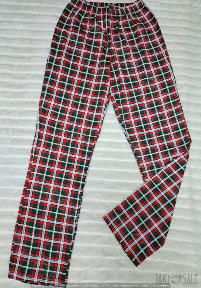 Брюки прямого крою виконані в класичну клітинку в червоно-зеленій гаммі, завдяки чому гармонічно доповнюють верх.