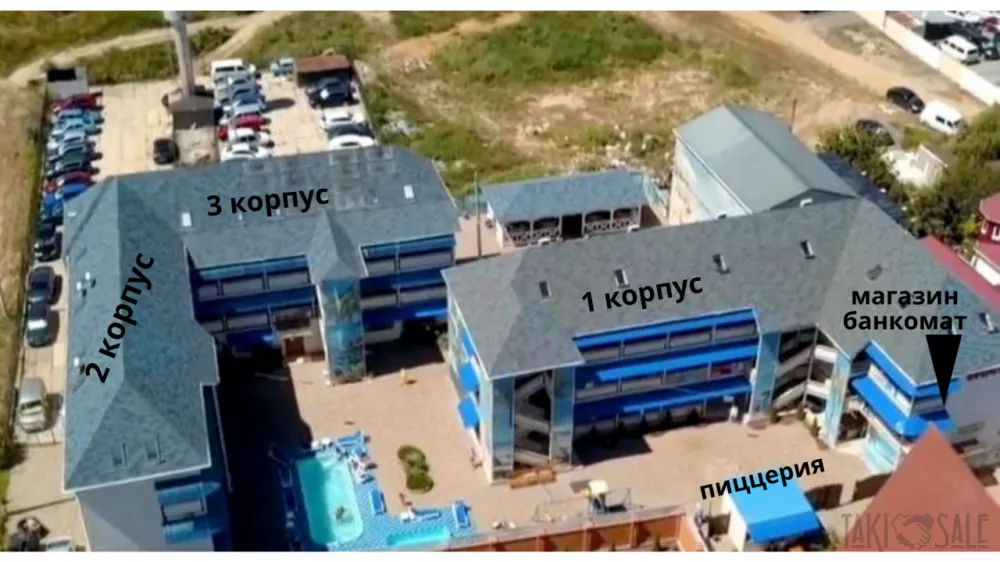 На территории, 3 корпуса , 64 номера со всеми удобствами + корпус для персонала.