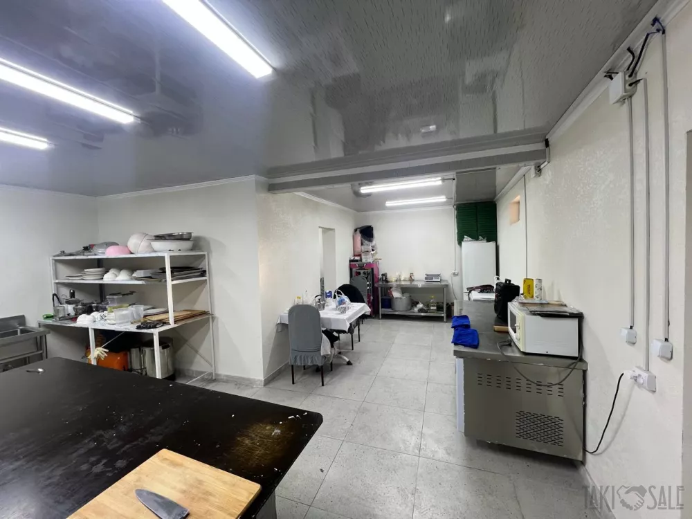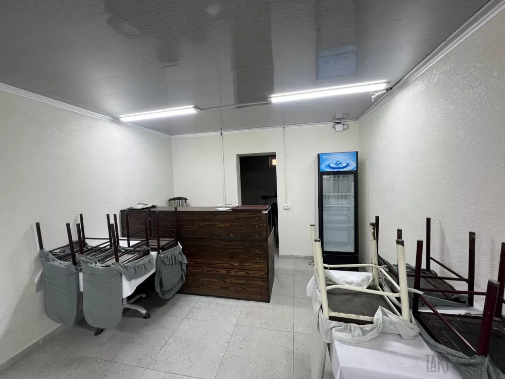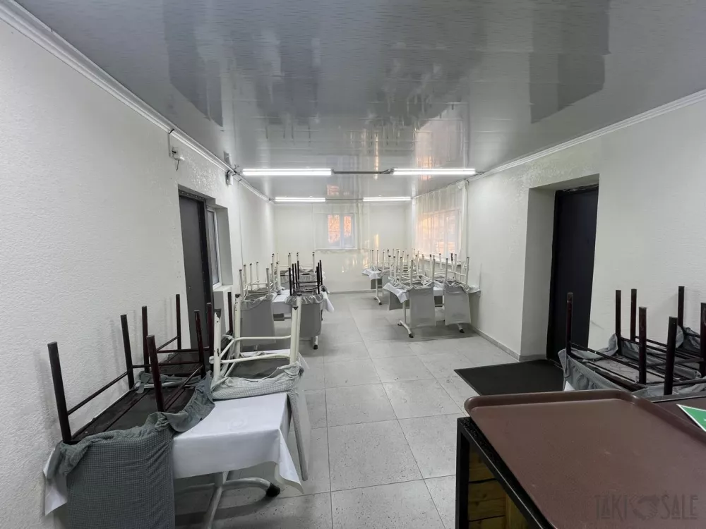 - Просторный светлый зал для гостей: вытянутый формат, окна, светодиодное освещение, моющиеся стены и пол,пластиковые потолки, несколько входов в служебные помещения. Столы и стулья в комплекте.